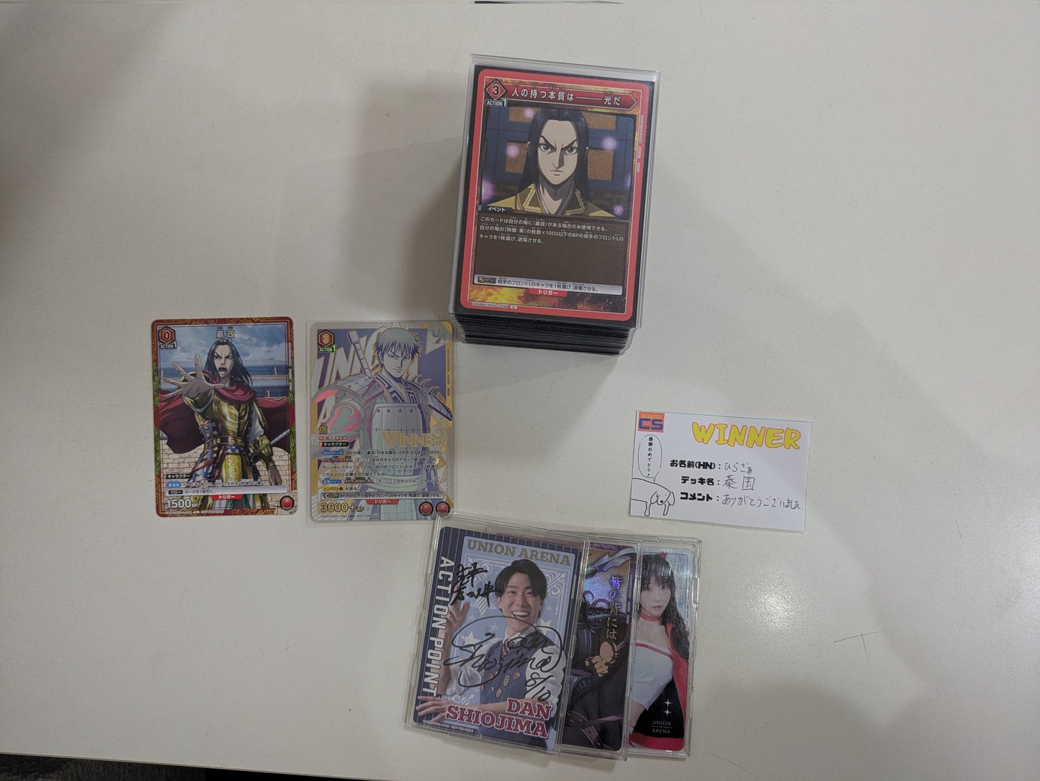 【大会結果】 ユニオンレア争奪バトルの優勝は【ひらざぁ】さんです✨🏆✨ 使用デッキ【秦国】 コメント【ありがとうございました】 おめでとうございます‼️ #ユニア #ユニオンアリー #UAv