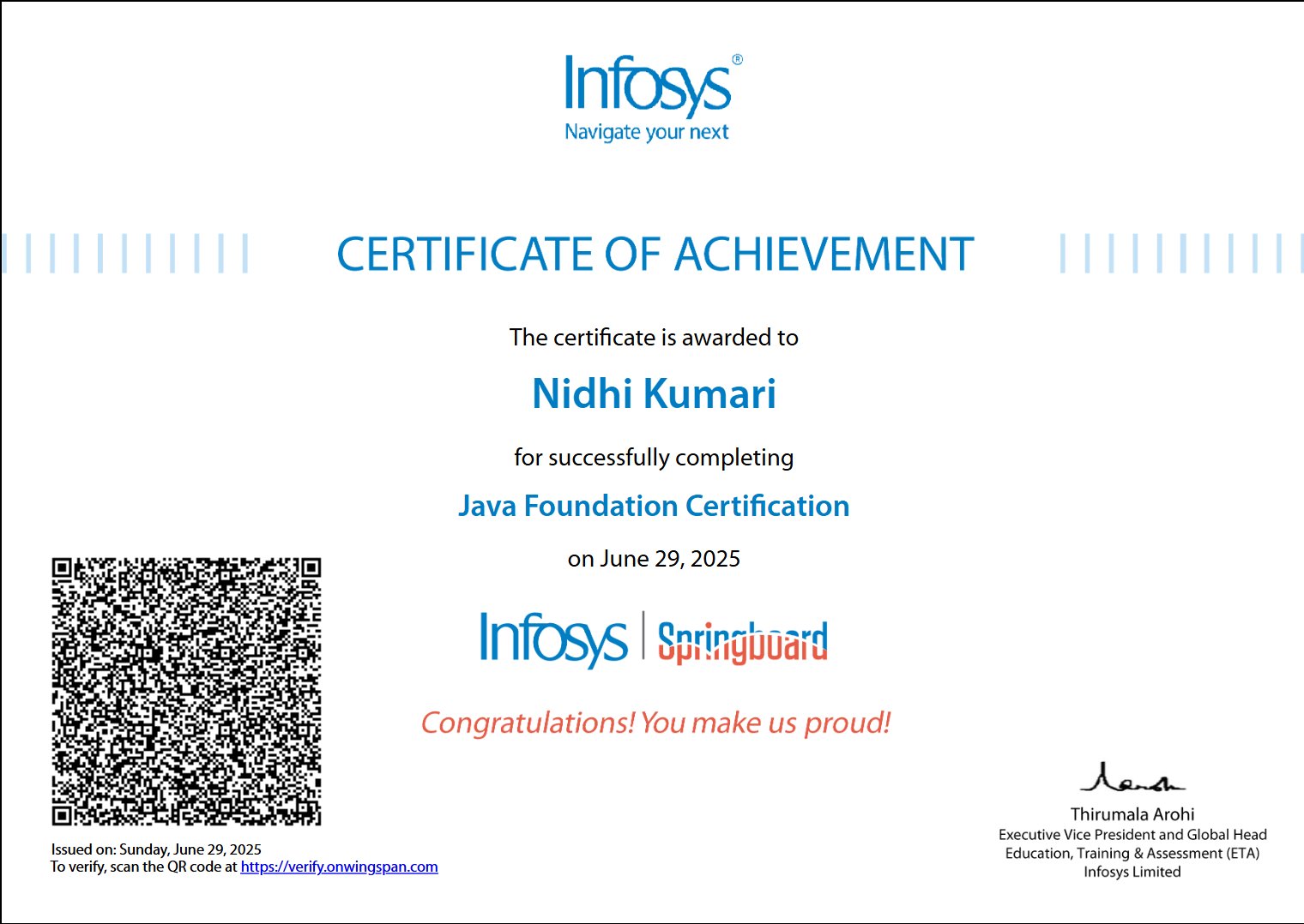 Proud to share that I’ve completed my Java Foundation Certification via @InfySpringboard 🌟