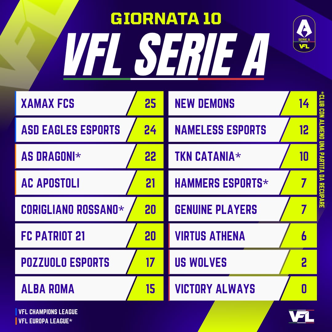 La VFL Serie A si fa sempre più avvincente! Dopo 10 giornate, Xamax FCS comanda la classifica con 25 punti, tallonata da ASD Eagles Esports a quota 24.