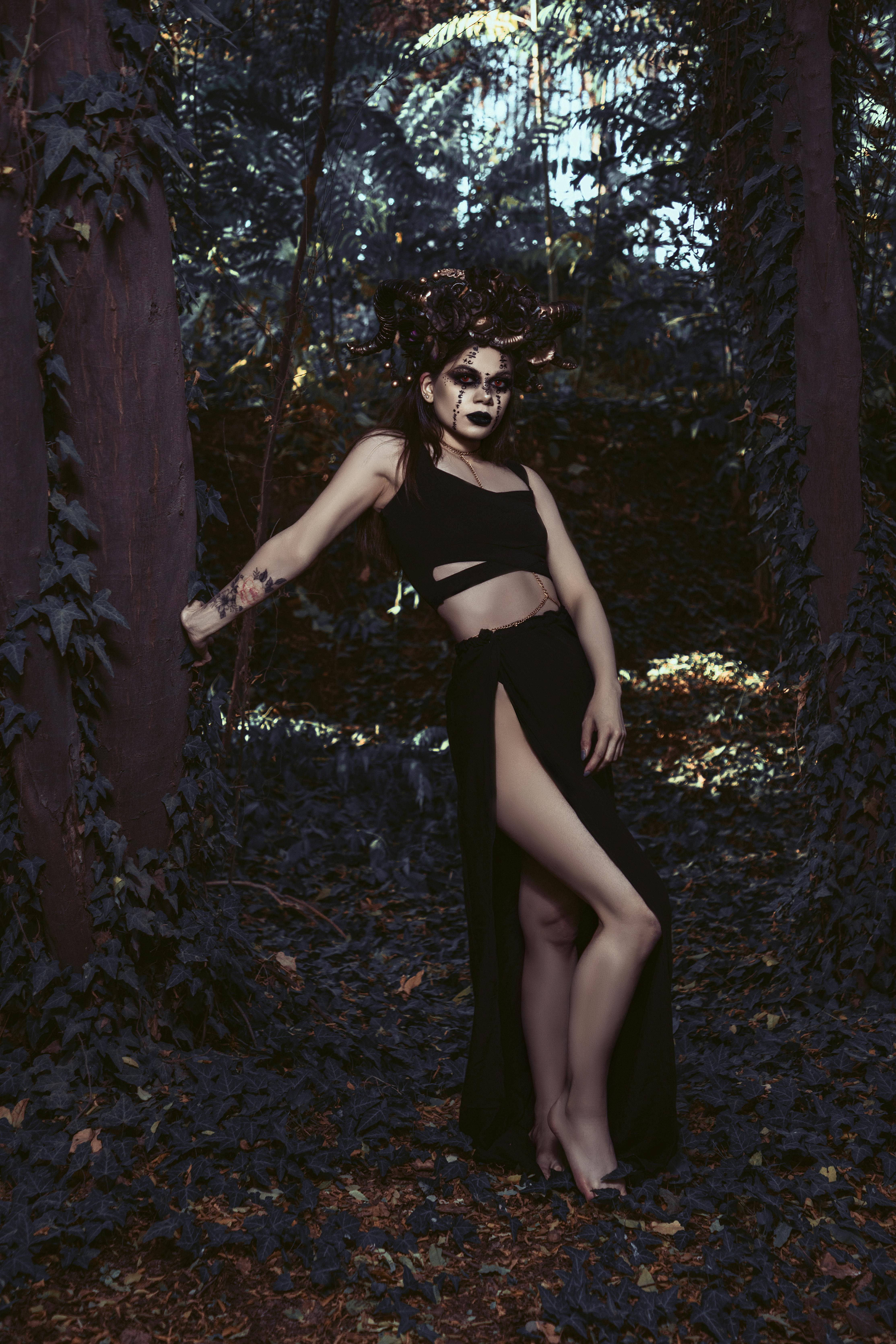 The woods finally whispered her name. In midnight silk, her gaze pierces the ancient gloom. An ancient spirit awakes, reclaiming the heart of the deep forest.
