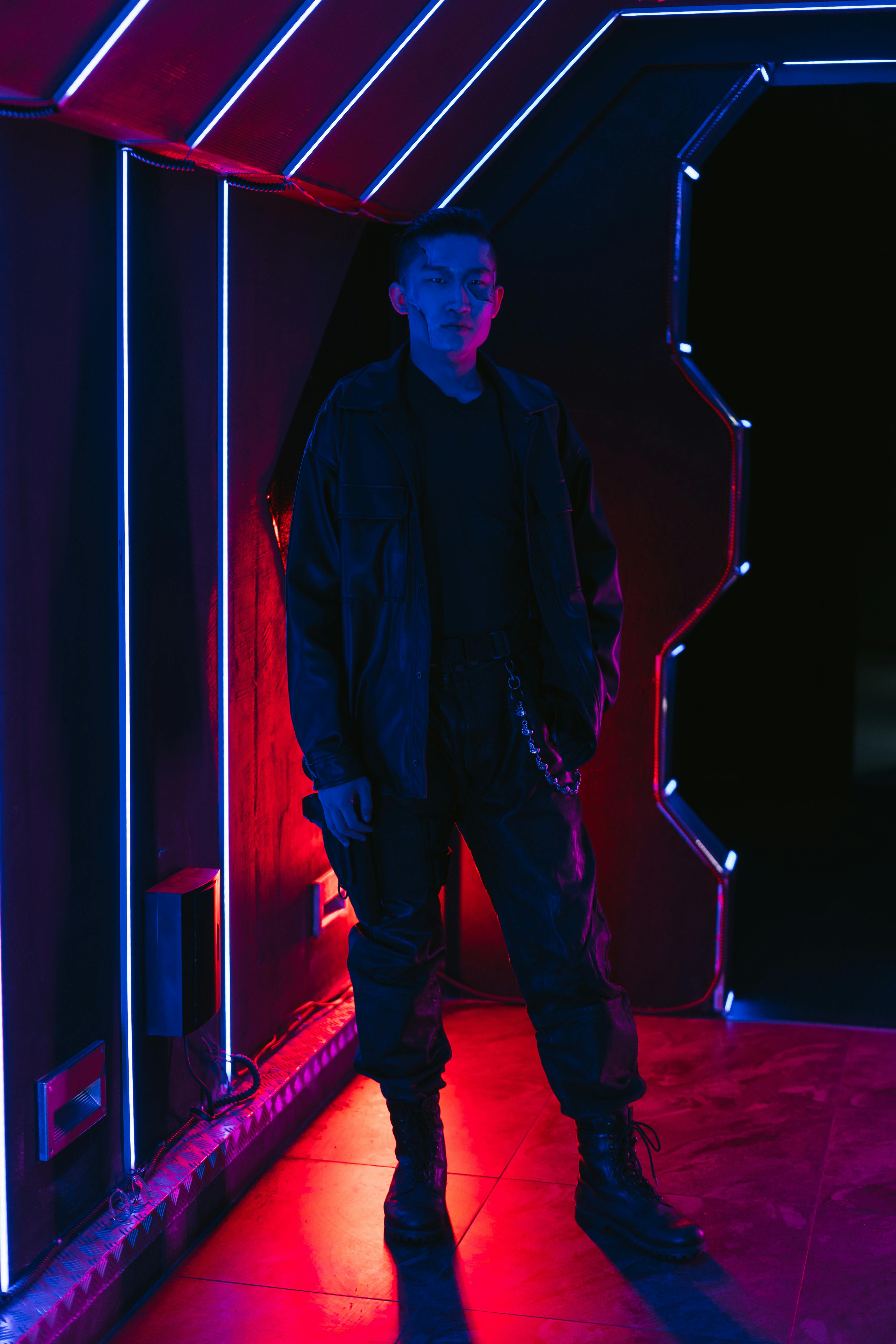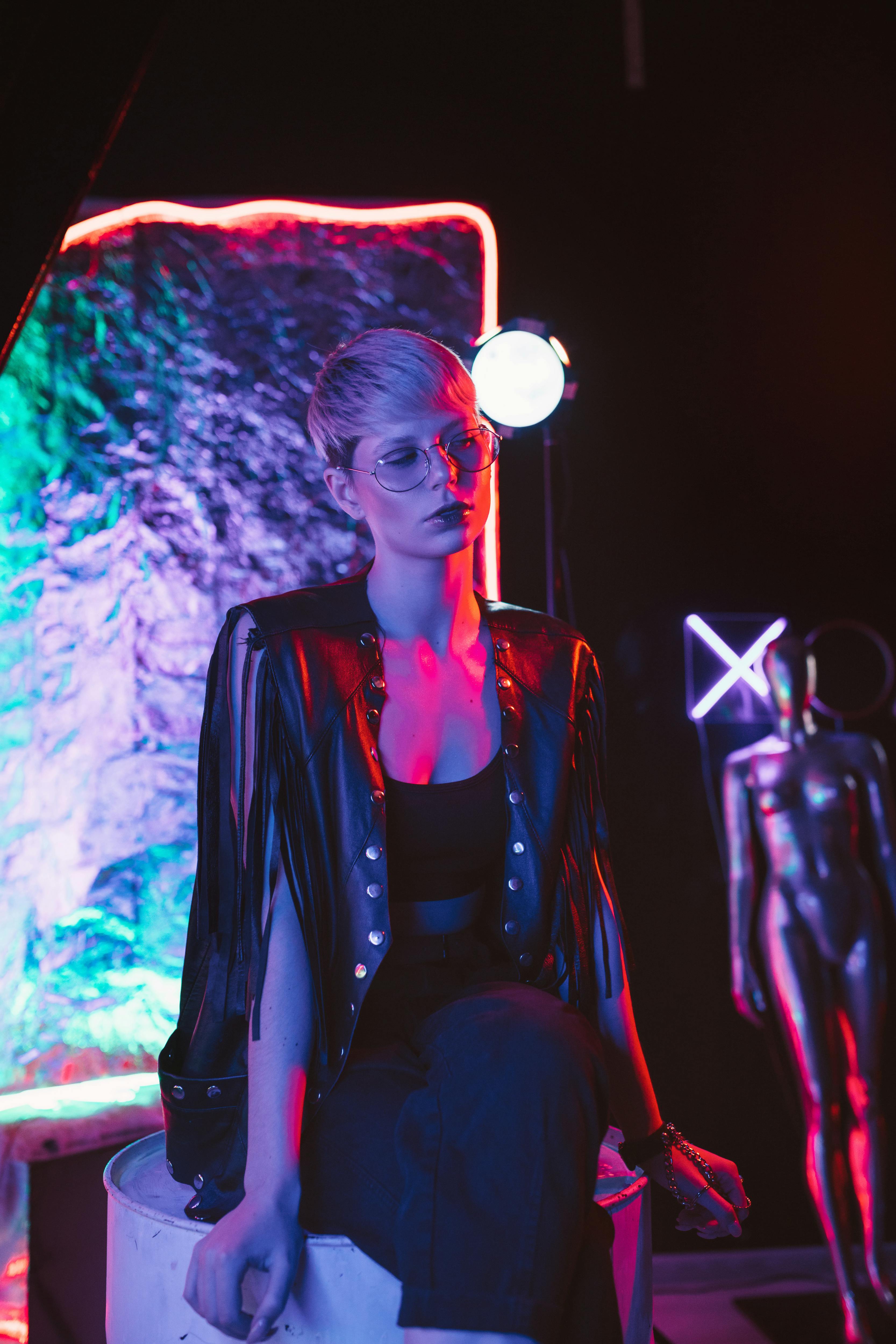 Neon shadows whisper secrets. Purple light sculpts her face, a silent observer in dark leather against the glowing X. The night holds its breath for her next impossible move.