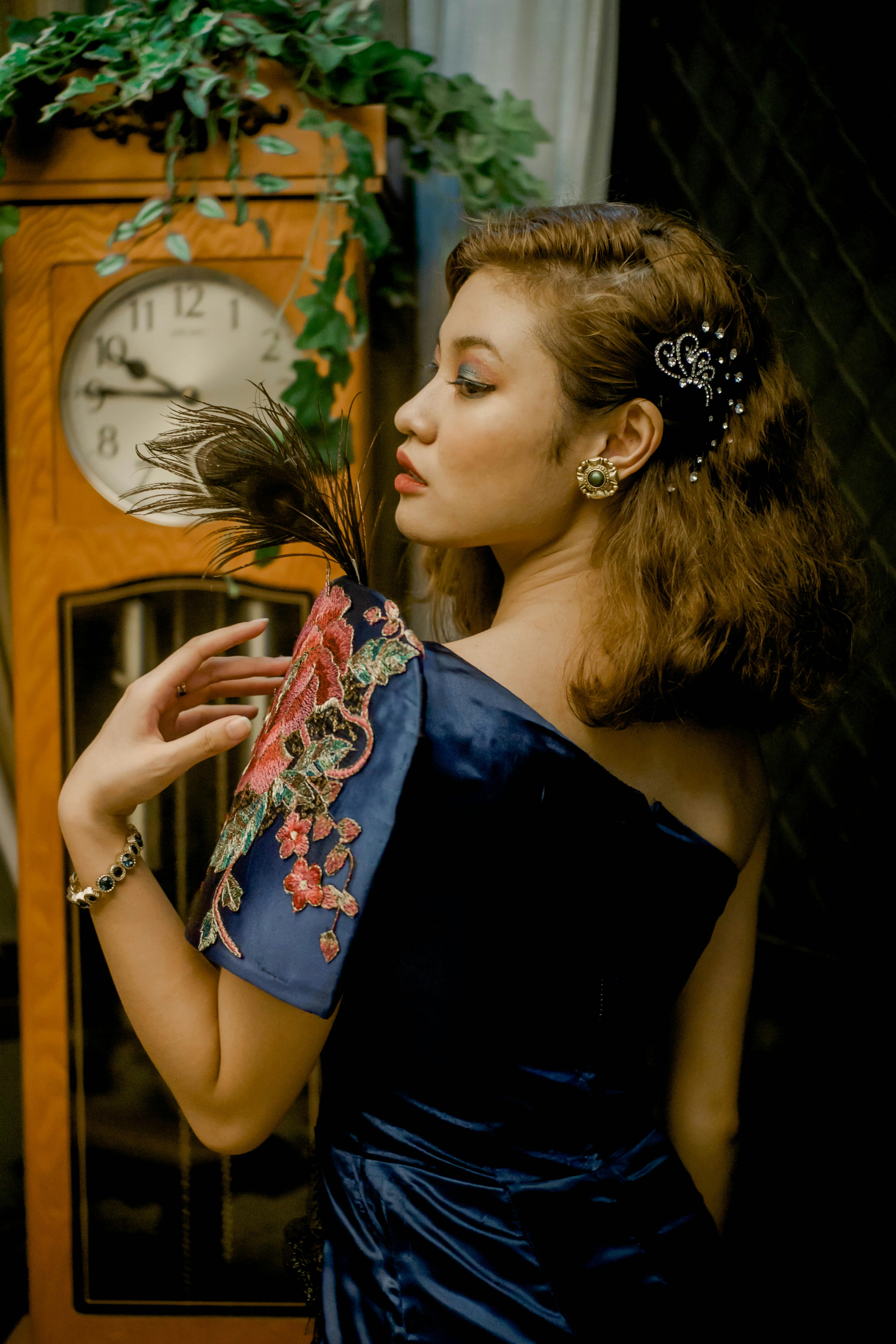 The grandfather clock stopped for her. A velvet shoulder, blooming with scarlet artistry, framed by a mysterious dark feather. She turned slowly, a universe of untold narratives gathering in her gaze.