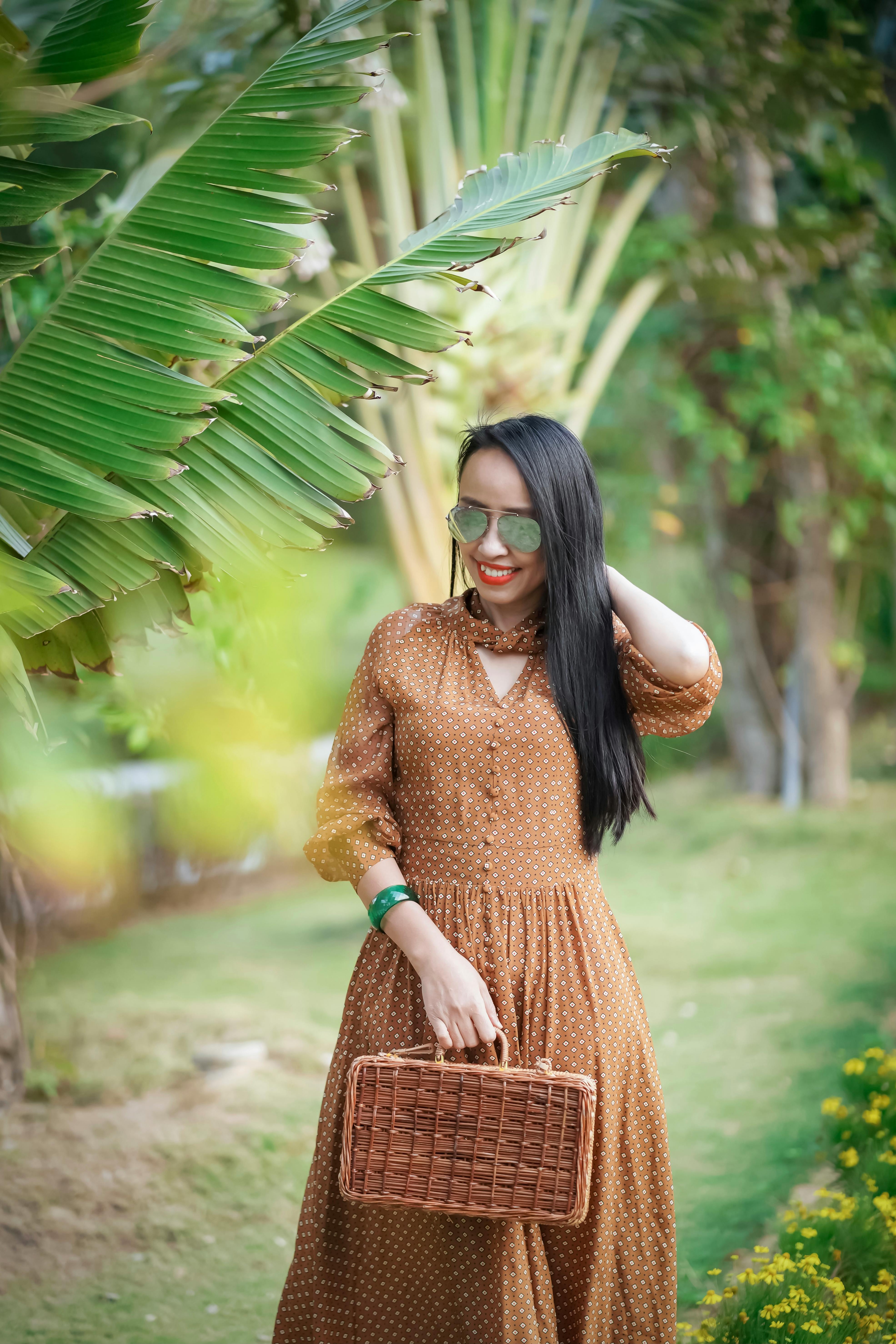 The sun knows her secret, painted on her smile. Sunglasses hide her gaze, a polka dot dress flowing under broad green leaves. She pauses, one fleeting moment before a new chapter unfolds, leaving only a lingering warmth.