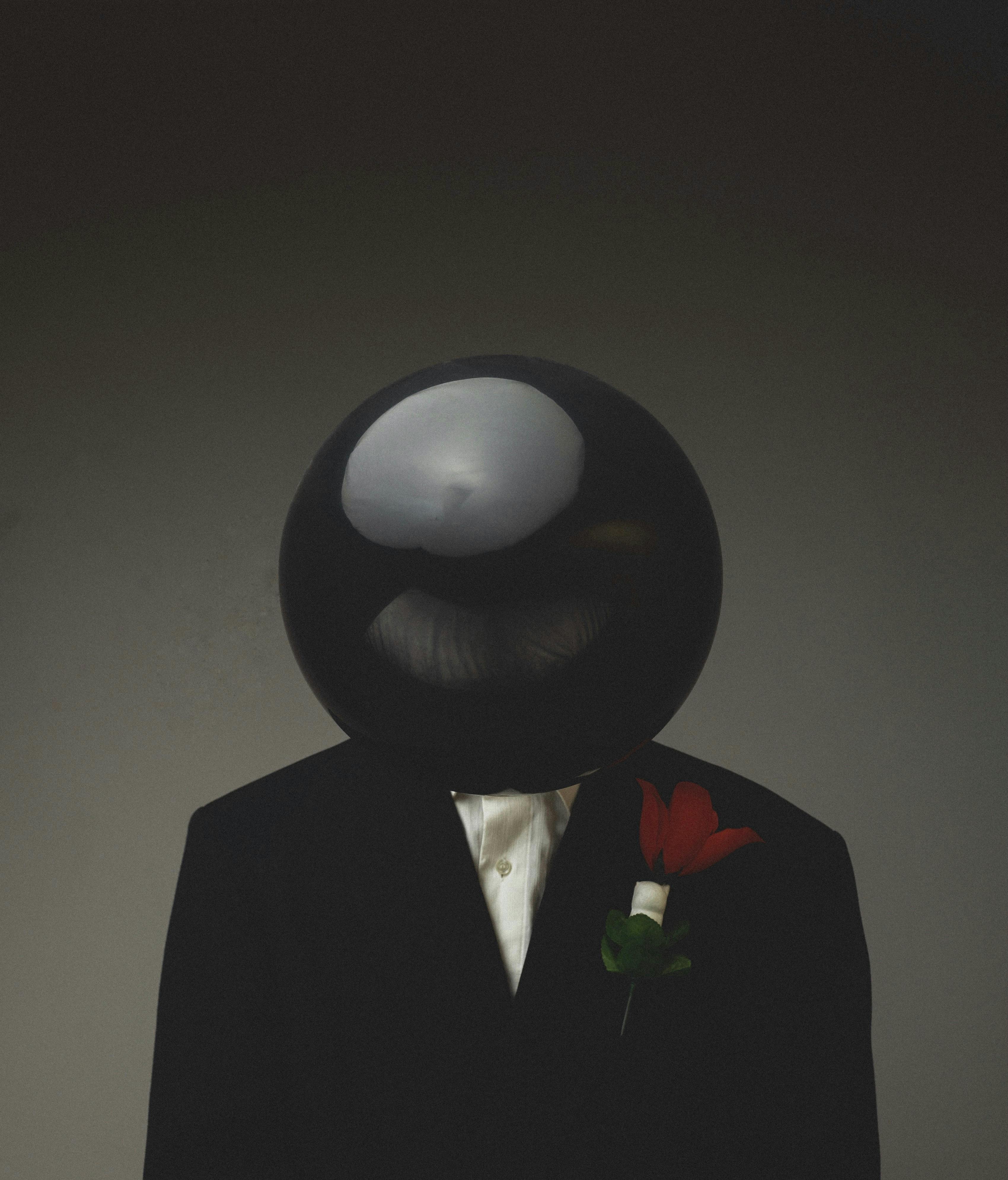 He wore his secrets like a polished helmet. A gleaming black orb sat atop his suit, catching every stray beam. He offered a vibrant red flower, a singular, quiet confession without a face.
