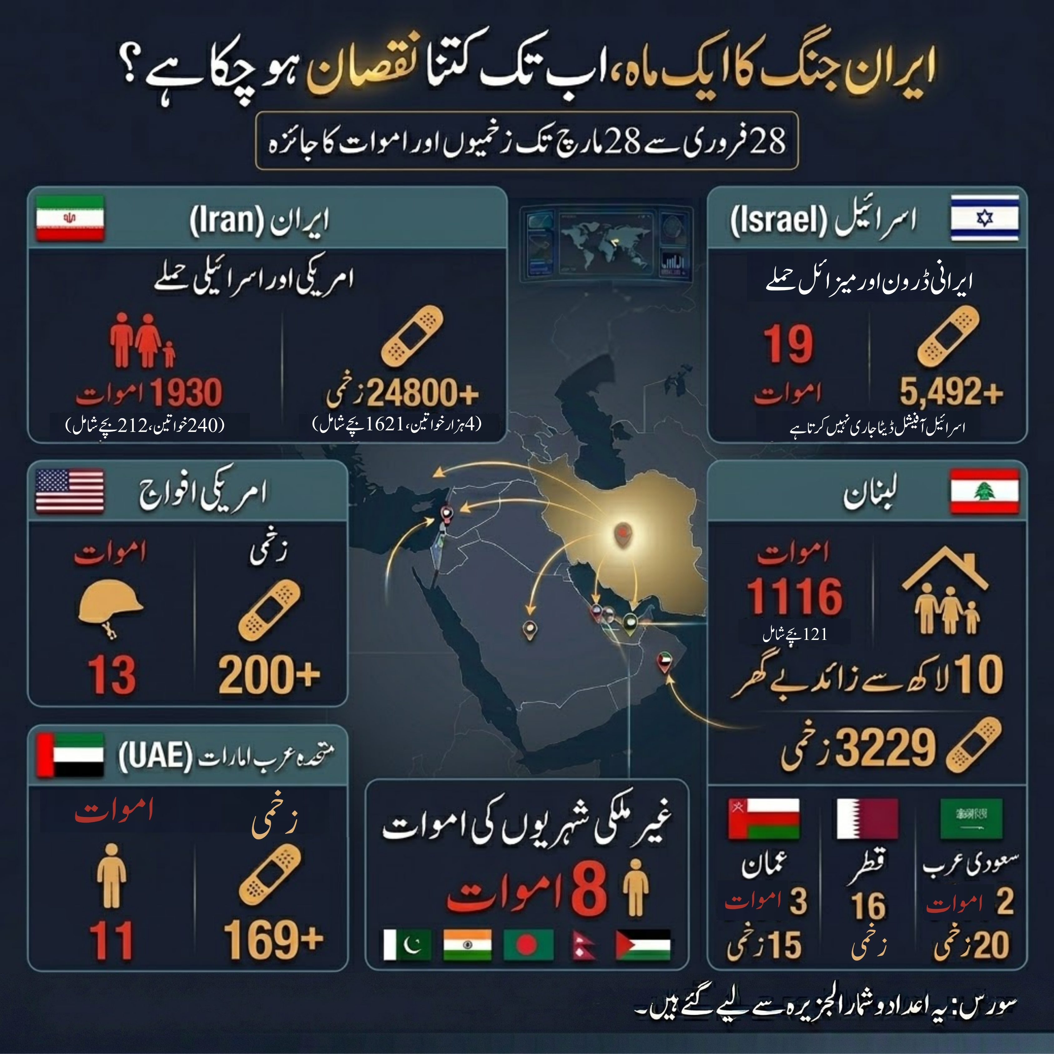 28 فروری کو امریکا اور اسرائیل کی جانب سے ایران پر حملوں کو ایک ماہ ہوچکا ہے۔ جنگ میں اب تک ہزاروں ہلاکتیں اور زخمی رپورٹ ہوئے ہیں جب کہ بے گھر ہونے والے کی تعداد بھی ہزاروں میں ہے۔ اب تک کے رپورٹ شدہ اعداد و شمار کیا ہیں، جانیے اس گرافک میں.