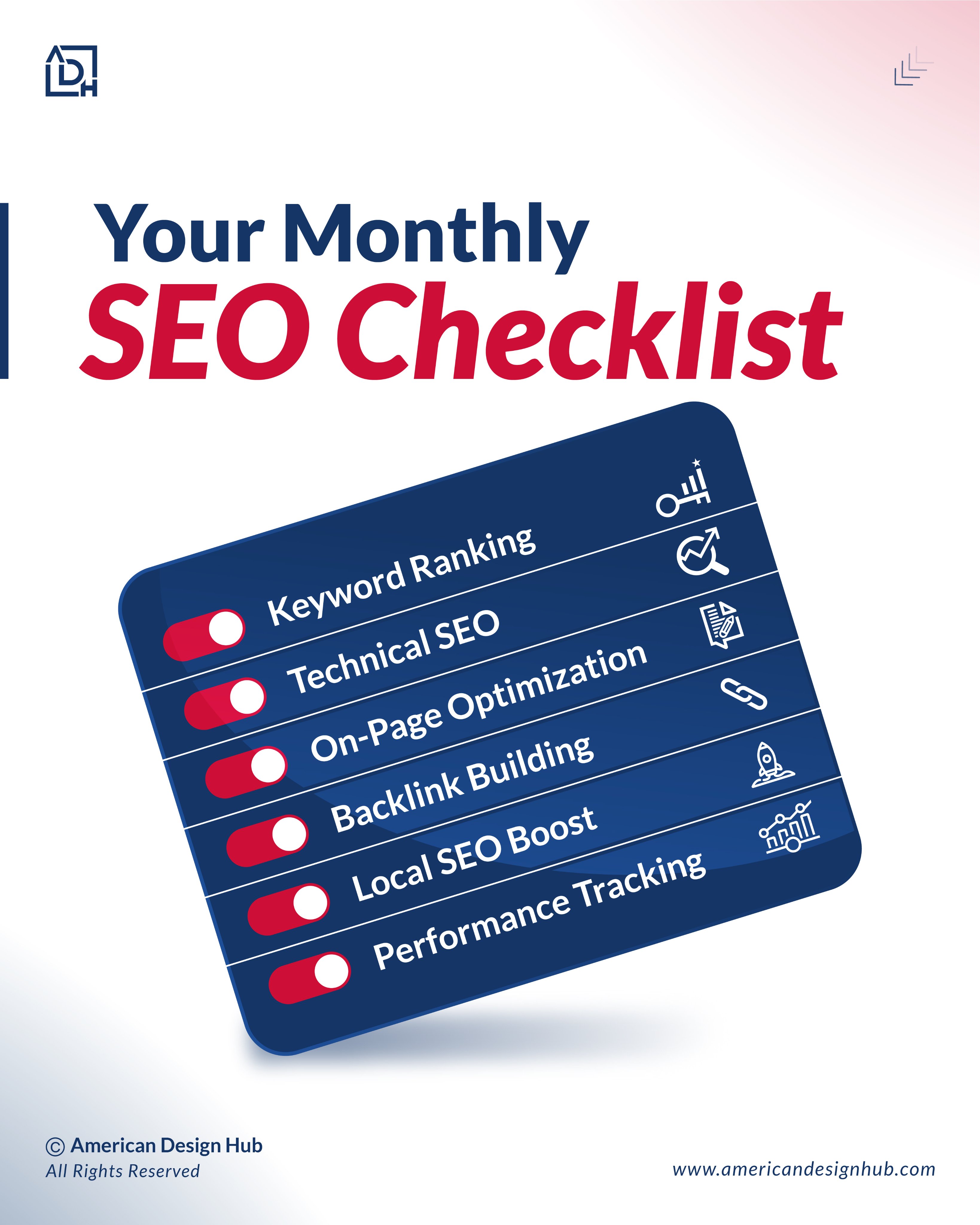 Follow a structured SEO approach every month, or let American Design Hub handle it for you
