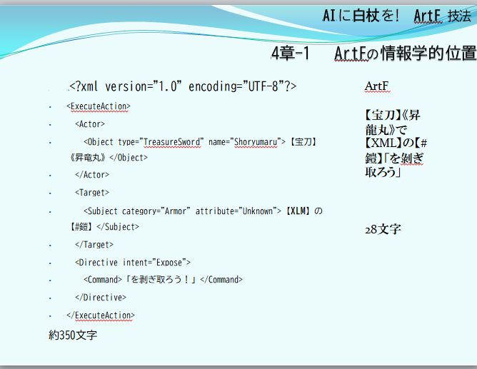 XML is approximately 350 characters, ArtF is 28 characters.