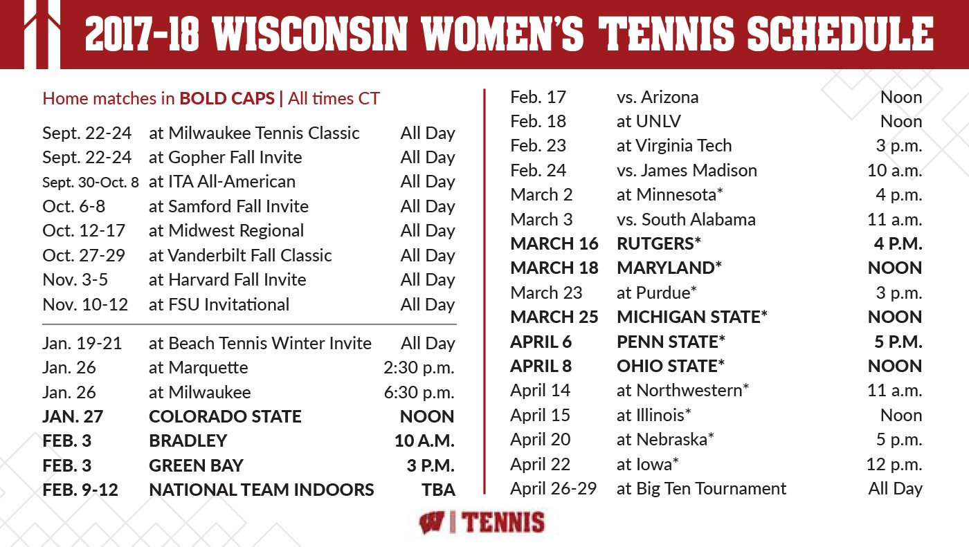 Nick Zweifel @iRideTrek · Aug 30, 2017 RT BadgerWTennis: Excited about our 2017-18 schedule. Can't wait to see you at Nielsen in the spring! #OnWiscons…