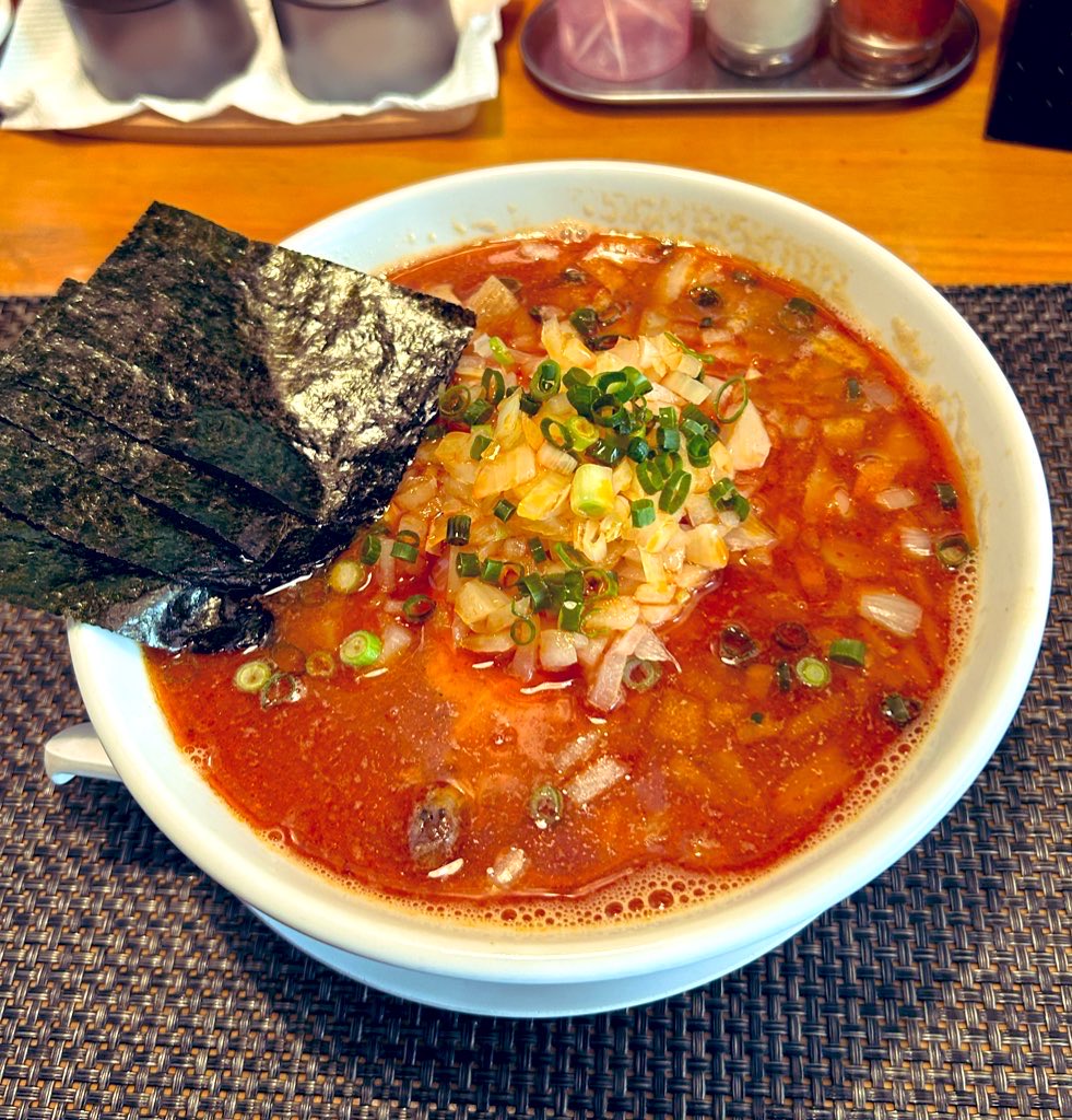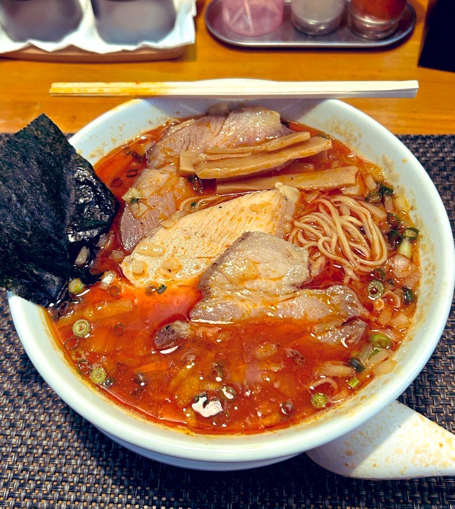 クラガンモア @Cragganmore1869 · Feb 15 #寛 #特製辛味噌 今日の遅お昼 鶴瀬の寛-くつろぎ-さんで特製辛味噌そば を5辛(激辛)オーダー 辛味は自家製辣油を使っているとのこと 決して強辛ではないけど、しっかり汗かく旨辛♪ 特製だと海苔のほかチャーシューが3枚に!玉ねぎが良いアクセントのスープも美味でした♪ ごちそうさまでした😋P 11 194