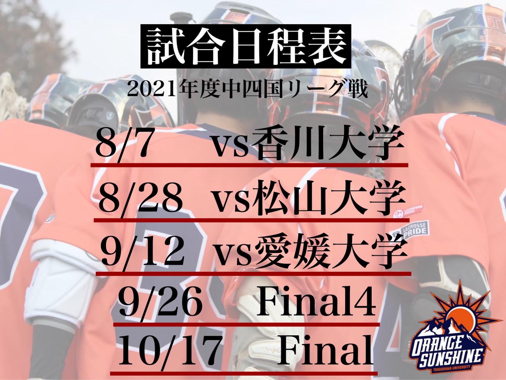 徳島大学男子ラクロス部 @orangesunshines · Jul 14, 2021 【2021年度中四国リーグ戦】 今年度リーグ戦の対戦カードが決定致しました。 チームで掲げた目標を達成するためにも一戦一戦ベストを尽くして戦います🔥 応援よろしくお願い致します!🎌 ⚠️無観客での開催となりますので、会場名は控えさせていただきます。 #克 #be #a #messengeYl 1 1 4