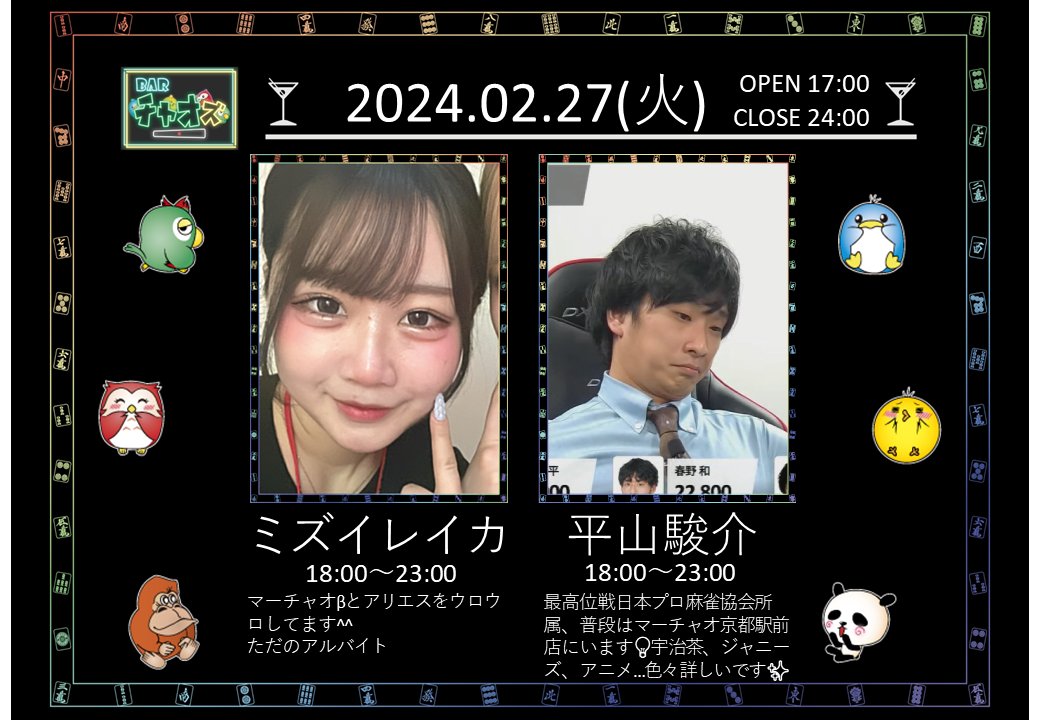麻雀BARチャオズ【公式】 @chaosbar_majan · Feb 27, 2024 本日2/27(火)はNEWスタッフが登場💡 最高位戦日本プロ麻雀協会所属 ✨平山駿介プロ✨が来店です💕 🍸酒井マスター💖ミズイレイカもいますよ🎶 17時OPEN、ご来店をお待ちしております✨ #麻雀BARチャオズ #OPEN #平井駿介 #ミズCN62c 1 10 1.4K
