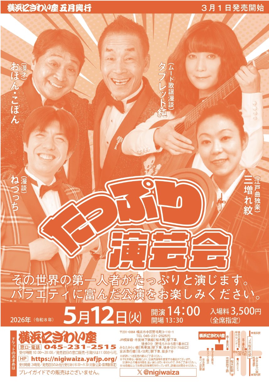 アテルンジャー ☆ タ ブ純のかける曲などを @ateru68 · Mar 21 「タブレット純 情報】⤵️ 横浜(神奈川) 『たっぷり演芸会 』 5月12日(火)14:00開演(13:30開場) 横浜にぎわい座. 芸能ホール 全席指定 3500円 出演 ねづっち タブレット純 三増れ紋 おぼん・こぼん �nigiwaiza.yafjp.org/perform/archiv…B #tabjun1422 #ラジオ日本 #jorf #ぎふチャン #ラジオ関西 #タブごんW 1 1 62
