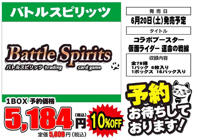 おじゃま館イオンモール東員店 @ojamakan_toin · 12m 🌟トレカ予約情報🌟 🔥🔥2026年6月20日発売予定‼🔥🔥 【#バトルスピリッツ 】 「仮面ライダー 運命の戦線」 ✨予約受付中です✨ ご予約するとお安くなります😊 予約してお得に手に入れちゃいましょう‼ 是非 #おじゃま館 イオンモールDx54JwL 74