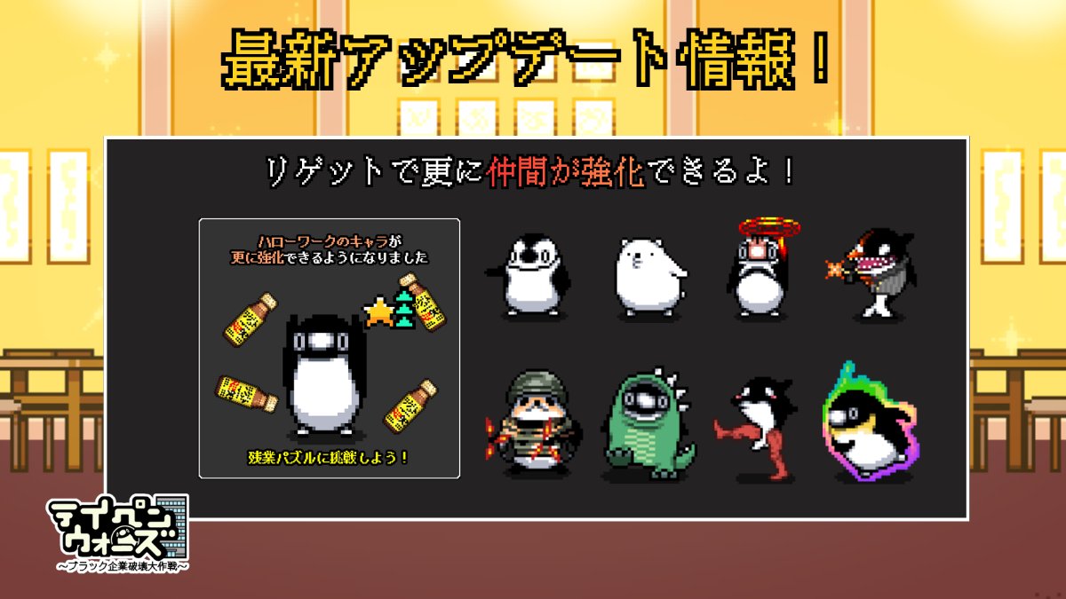 テイコウペンギン🐧 @teikoupenguin · 1h 【アップデート情報】 #テイペンウォーズ のリゲットで 仲間を更に強化できるようになったぞ。 リゲットは『残業パズル』で 獲得したポイントと交換できるみたいだ。 皆も是非『残業パズル』をプレイして ハローワークのの仲間を強化してみてくれ。 ▼ダウンロードはこちら onelink.to/wars_teipen_x 10 47 1.7K