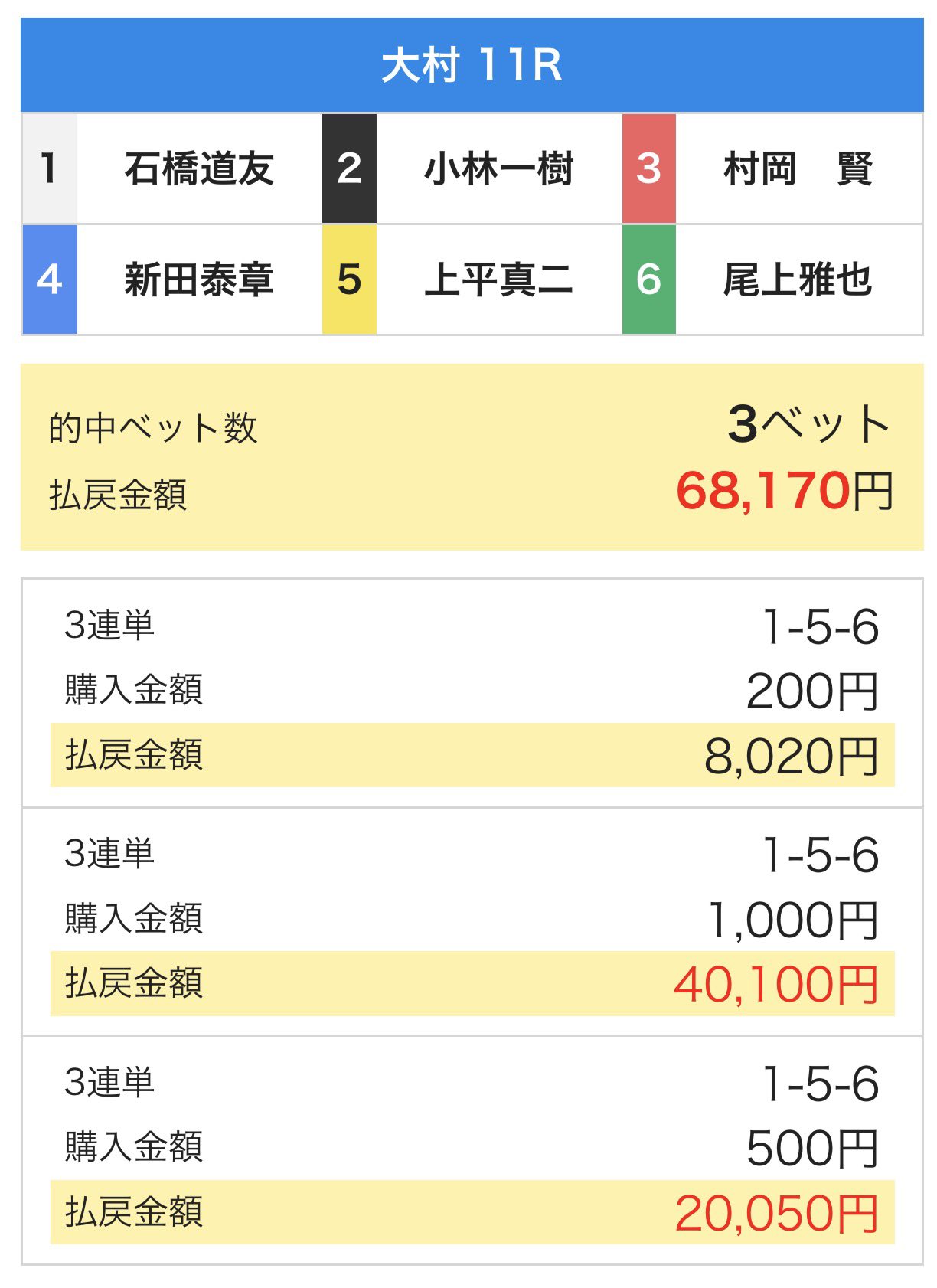 ããã«ã¡ã¯ãå®èœéŽæã§ãã æ¬æ¥ã®çµæã¯ 8ã¬ãŒã¹äž8ã¬ãŒã¹çäž ã§ããã ðžçäžã¬ãŒã¹ 接5RïŒ1-2 ð¯ïŒ2.1åïŒ äžåœ12RïŒ1-2 ð¯ïŒ2.6åïŒ è²é¡1RïŒ1-3 ð¯ïŒ2.5åïŒ çŠå²¡8RïŒ1-3 ð¯ïŒ5.6åïŒ æŽ¥12RïŒ1-2 ð¯ïŒ2.2åïŒ çŠå²¡11RïŒ1-2 ð¯ïŒ2.1åïŒ äœä¹æ±9RïŒ1-2 ð¯ïŒ2.6åïŒ äœä¹æ±11RïŒ1-2 ð¯ïŒ1.3åïŒ ðïž...