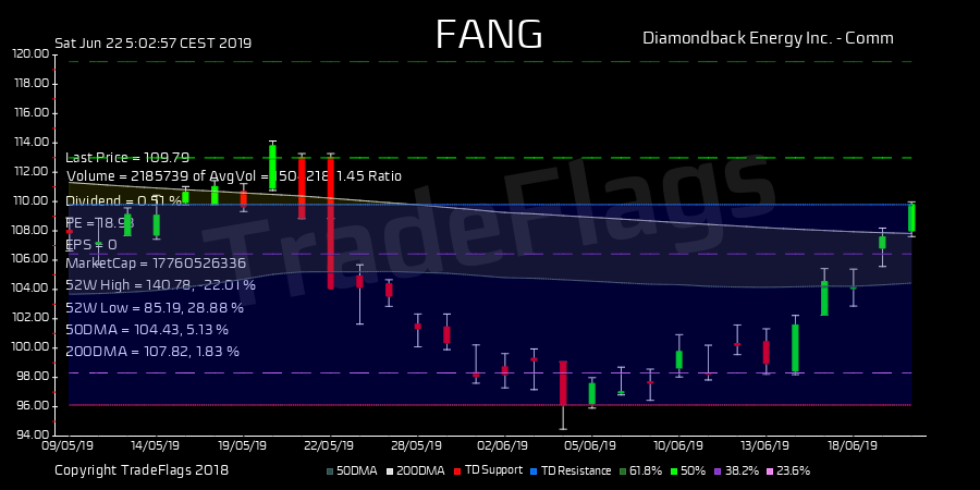 TradeFlags @TradeFlags · Jun 22, 2019 TD SELL $FANG at 109.79, Supp 96.12 Resis 109.79 R14 HiLo 44% T1Y 155 buy 1.6 PE 19.3 DIV 0.54% #Diamondbac #stocks #trading #finance #market bit.ly/2IwWF9e