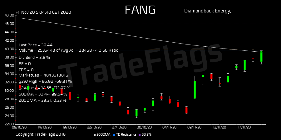 TradeFlags @TradeFlags · Nov 20, 2020 TD SELL $FANG at 39.81, Supp 24.74 Resis 39.81 R61 HiLo 31% T1Y 53 buy 1.9 fwdPE 10.1 DIV 4.02% #Diamondbac #stocks #trading #finance #market tinyurl.com/y66j5pah