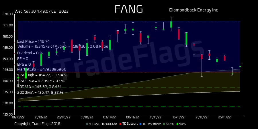 TradeFlags @TradeFlags · Nov 30, 2022 TD BUY $FANG at 147.14, Supp 144.13 Resis 167.03 R16 HiLo 75% T1Y 175 buy 2.0 DIV 7.96% #Diamondbac #stocks #trading #finance #market