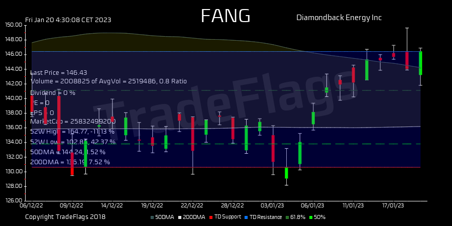 TradeFlags @TradeFlags · Jan 20, 2023 TD SELL $FANG at 146.43, Supp 130.62 Resis 146.43 R12 HiLo 70% T1Y 175 buy 2.0 DIV 7.96% #Diamondbac #stocks #trading #finance #market 20