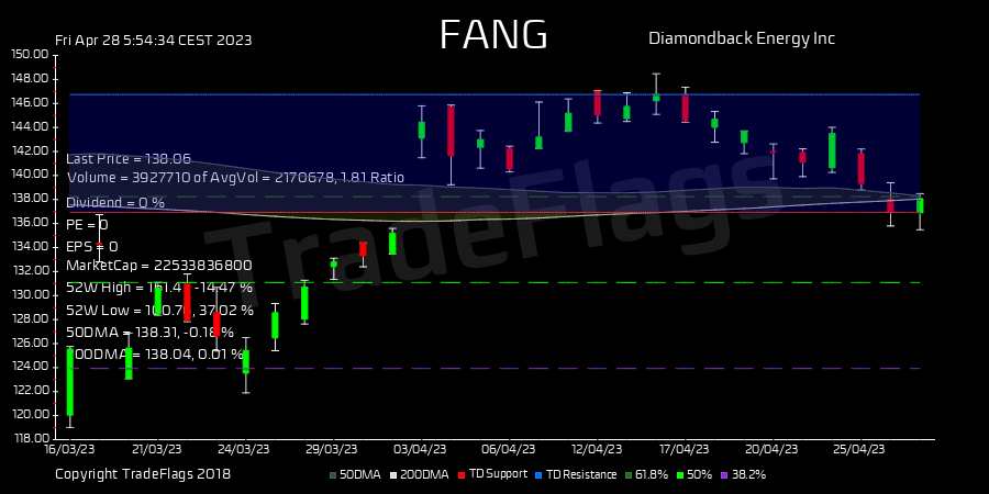 TradeFlags @TradeFlags · Apr 28, 2023 TD BUY $FANG at 138.06, Supp 136.93 Resis 146.74 R7 HiLo 62% T1Y 175 buy 2.0 DIV 7.96% #Diamondbac #stocks #trading #finance #market 30