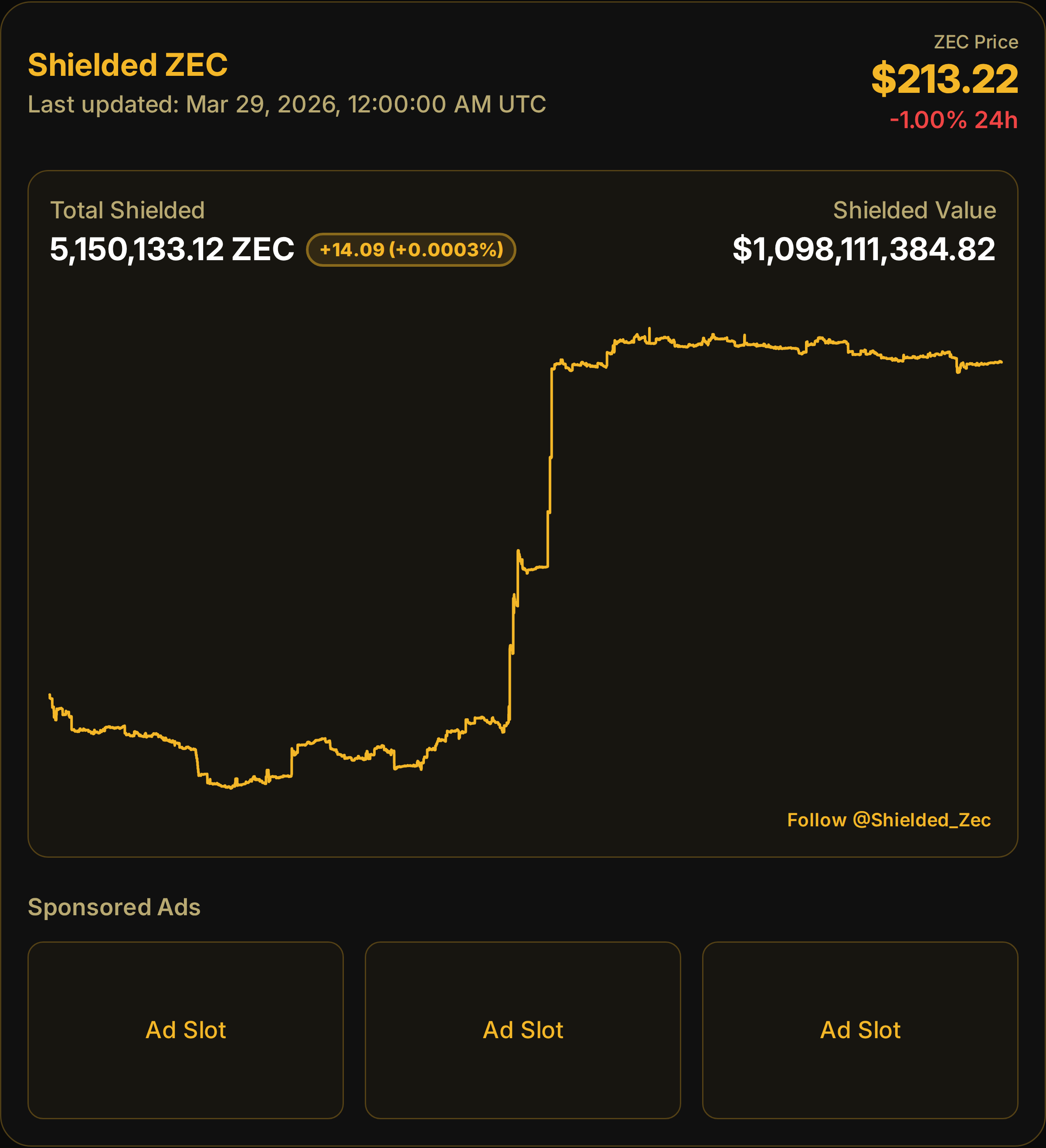 Zcash Shielded Supply: +14.09 $ZEC (+0.0003%) • Updated Mar 29, 2026, 12:00:00 AM UTC