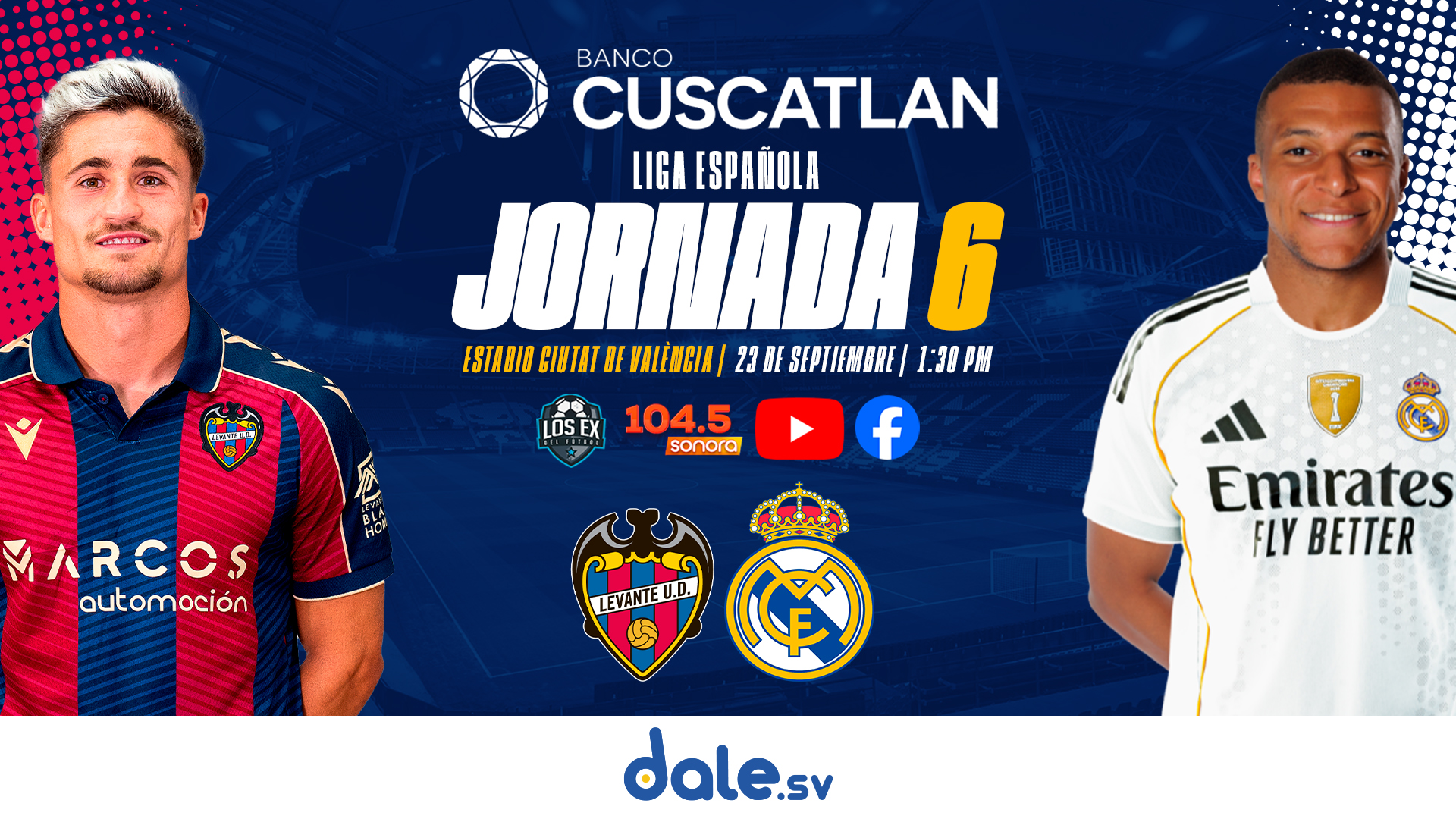 El #RealMadrid visita al #Levante en la Jornada 6 de #LigaEspañola. Puedes disfrutar del minuto a minuto por medio de la narración EN VIVO por @SonoraFM_sv y nuestros canales digitales 💻🎙tB