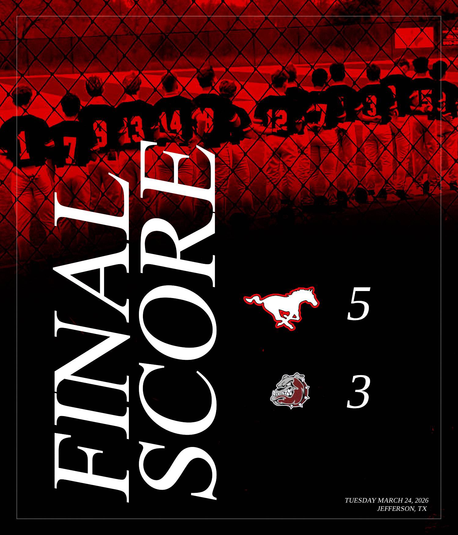 Hughes Springs Baseball @HS_MustangsBSB · 3d Final Hughes Springs 5 Jefferson 3 Mustangs look to sweep the series against Jefferson on Friday at home at 7 PM! #C.A.P.E @3ATxHsBaseball 8