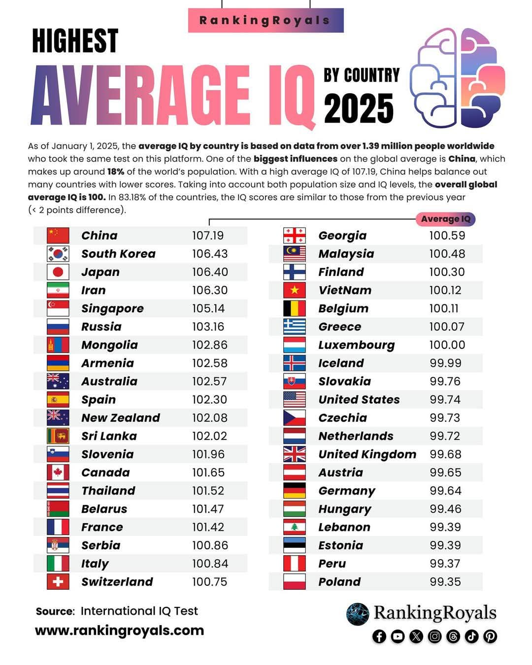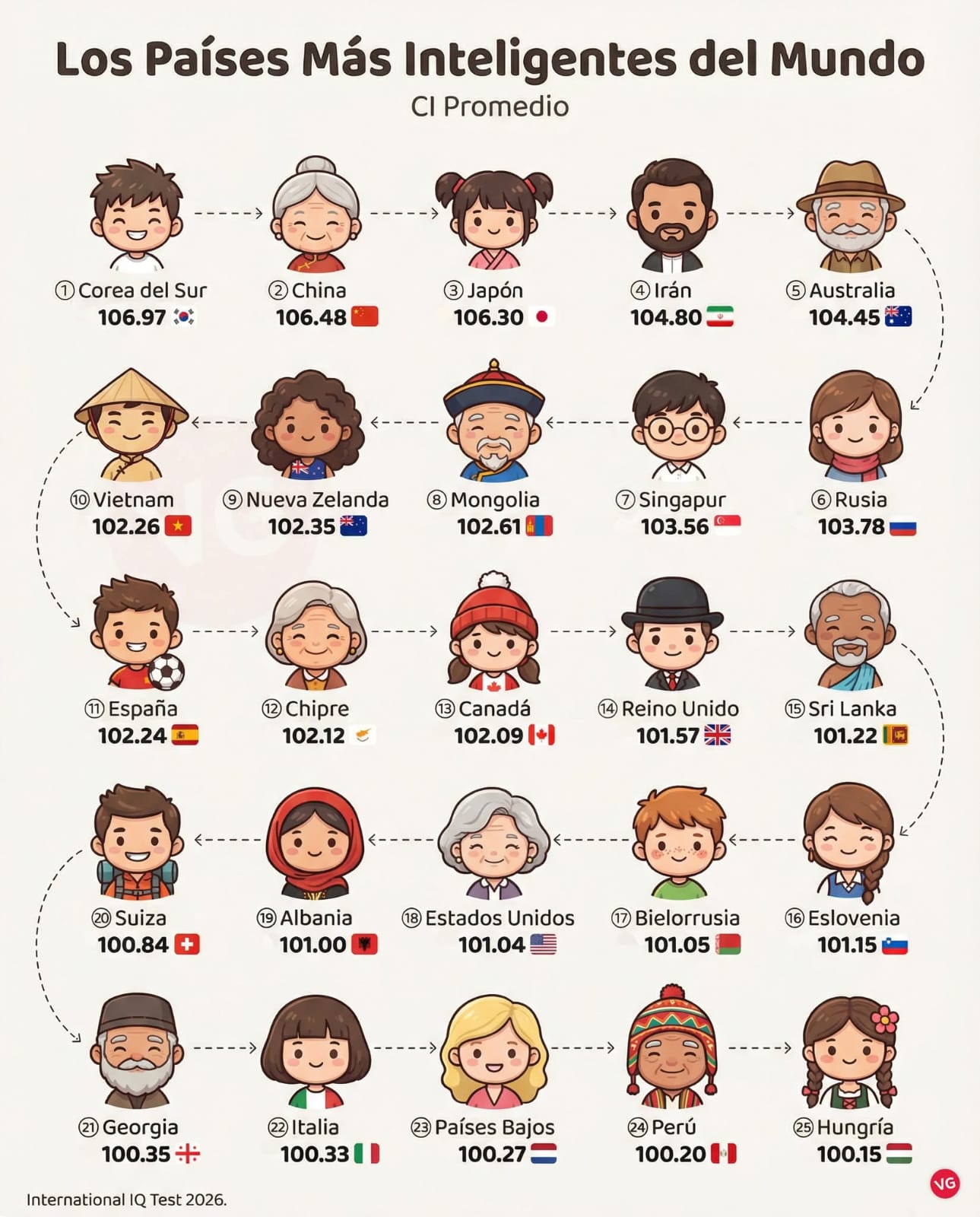 En 2026, Irán se sigue manteniendo en el 4to lugar mundial con población de mayor coeficiente intelectual mientras que EEUU ocupa el lugar 18. Así que, Irán no solamente se iguala a EEUU en ese rubro, además, lo supera de manera consistente.