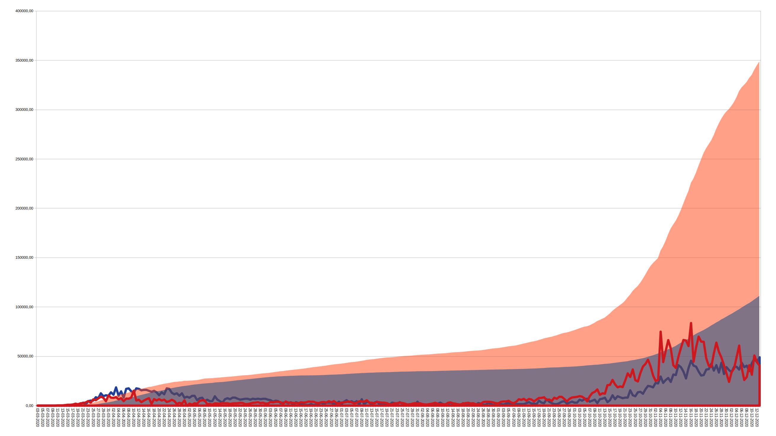 Com #libreoffice#Calc pode perder-se 1 pouco d produtividade p/ gráficos + complexos. Talvez seja o preço a pagar por software livre, ou talvez apenas falta de hábito. Aqui 1 gráfico c/ a evolução #COVID19#portugal, apenas o eixo dos infect acumulados (laranja) tem num/ reais.