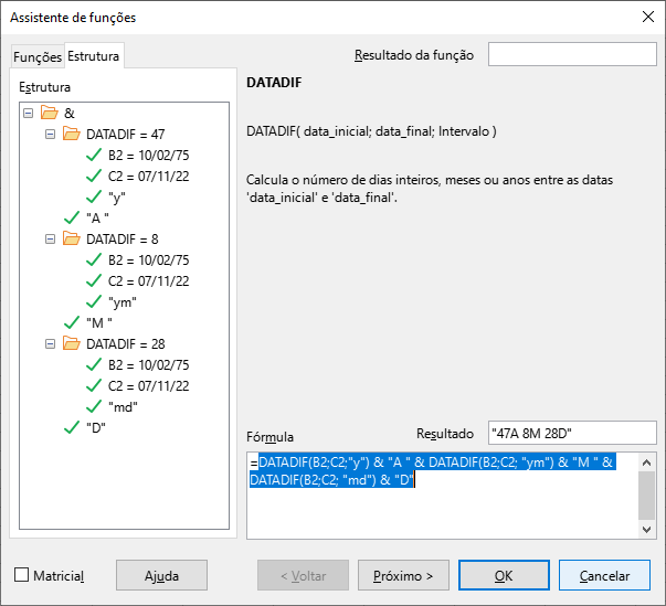 =DATADIF(B2;C2;"y") & "A " & DATADIF(B2;C2; "ym") & "M " & DATADIF(B2;C2; "md") & "D"