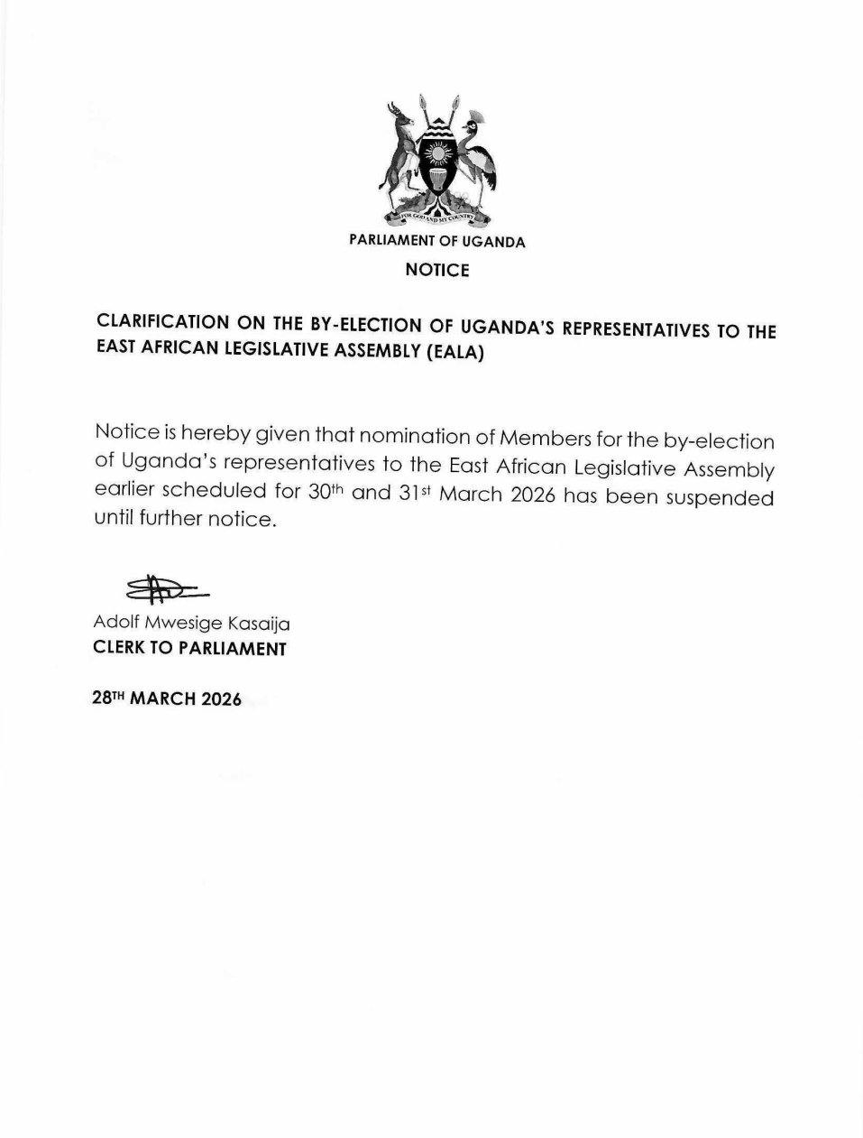 JUST IN: The Parliament of Uganda has suspended nominations for the by-election of Uganda’s representatives to the East African Legislative Assembly, which had been scheduled for March 30–31, 2026, until further notice.