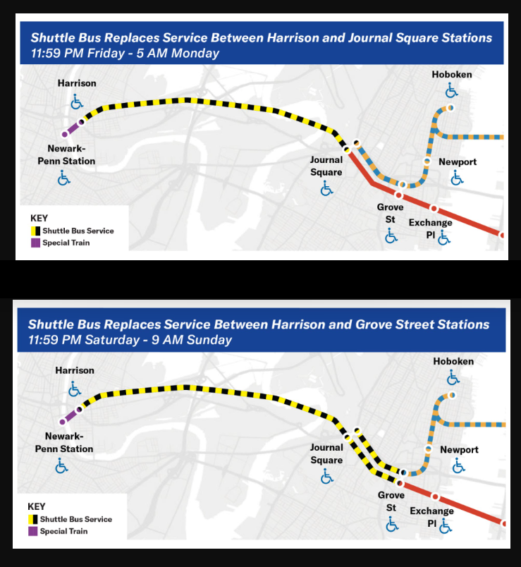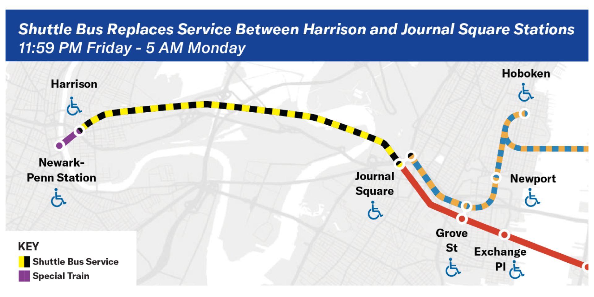 A special shuttle train will operate between Newark and Harrison stations, and free wheelchair-accessible shuttle buses will operate between Newark, Harrison, and Journal Square.