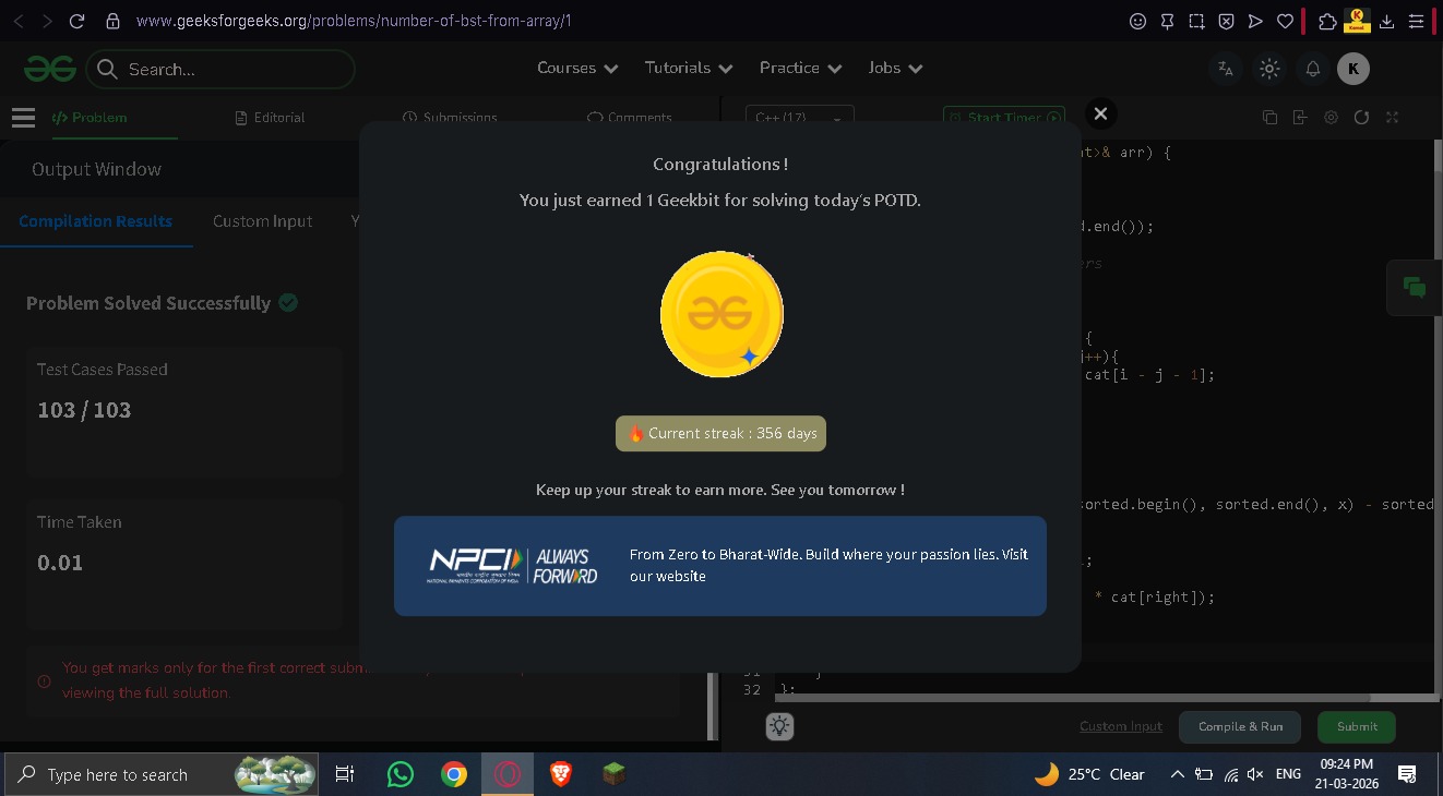 Vartika agrawal @agrawal_va81964 · Mar 21 Day 24 of #GFG60DaysChallenge 📅 21 March 2026 Continuing my 60-Day Problem of the Day streak on@geeksforgeeks powered by@NPCI_NPCI 🚀 Problem: Number of BSTs from Array 24 days in — consistency is becoming a habit �� #GeeksforGeeks #GFG #NPCI #Consistency #CodingJournJFQ 4