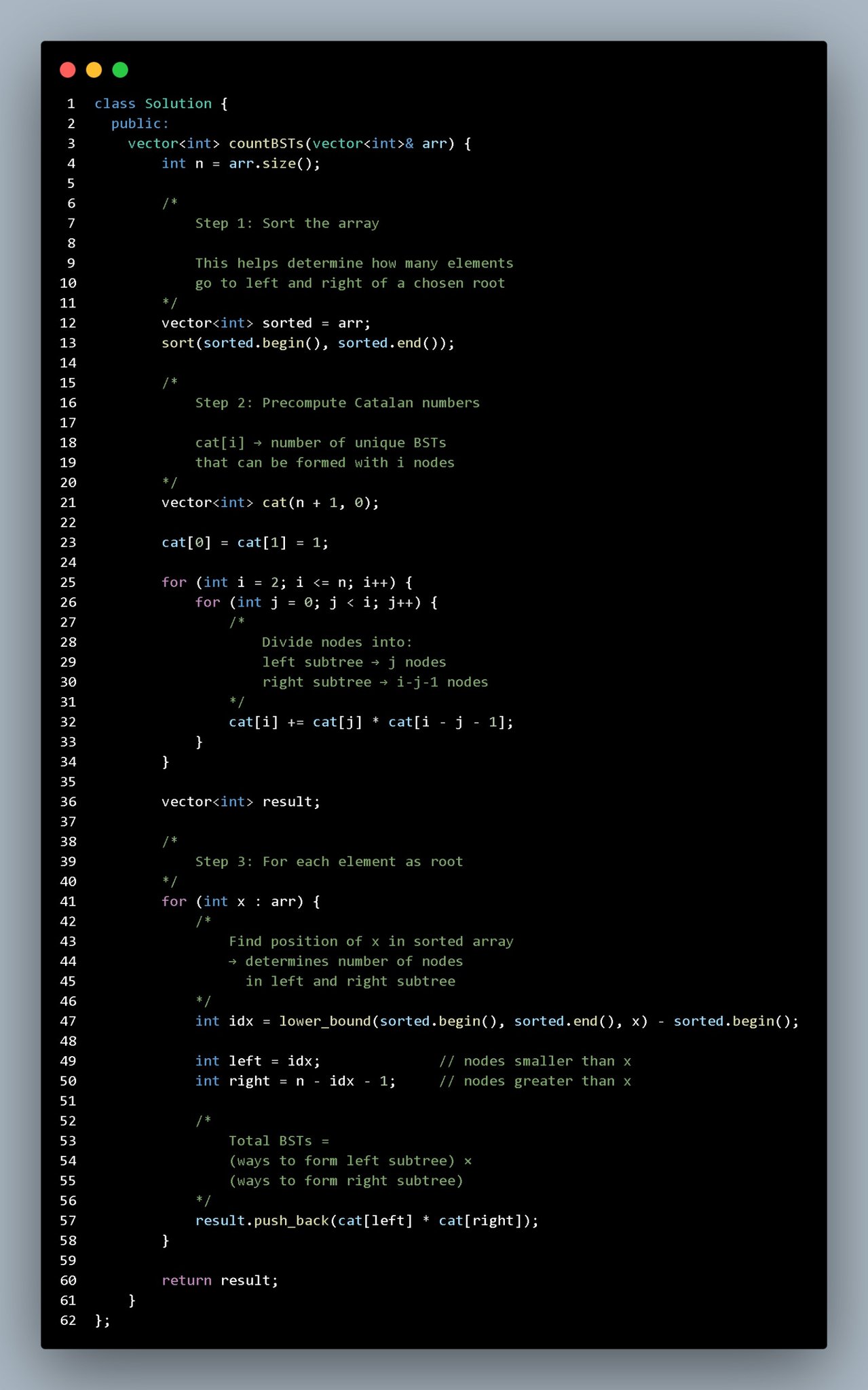 DEVX-S-400 🇮🇳 @SizixAsat9 · Mar 21 Day 4 of #GFG60DayPOTD (Restart) Count unique BSTs for each root. Key idea: Split into left & right nodes. Answer = Catalan(left) × Catalan(right) No need to build trees. #geekstreak60 #POTDwithGFG #GFG #DSA #coding #NPCI @geeksforgeeks @NPCI_NPCI 9