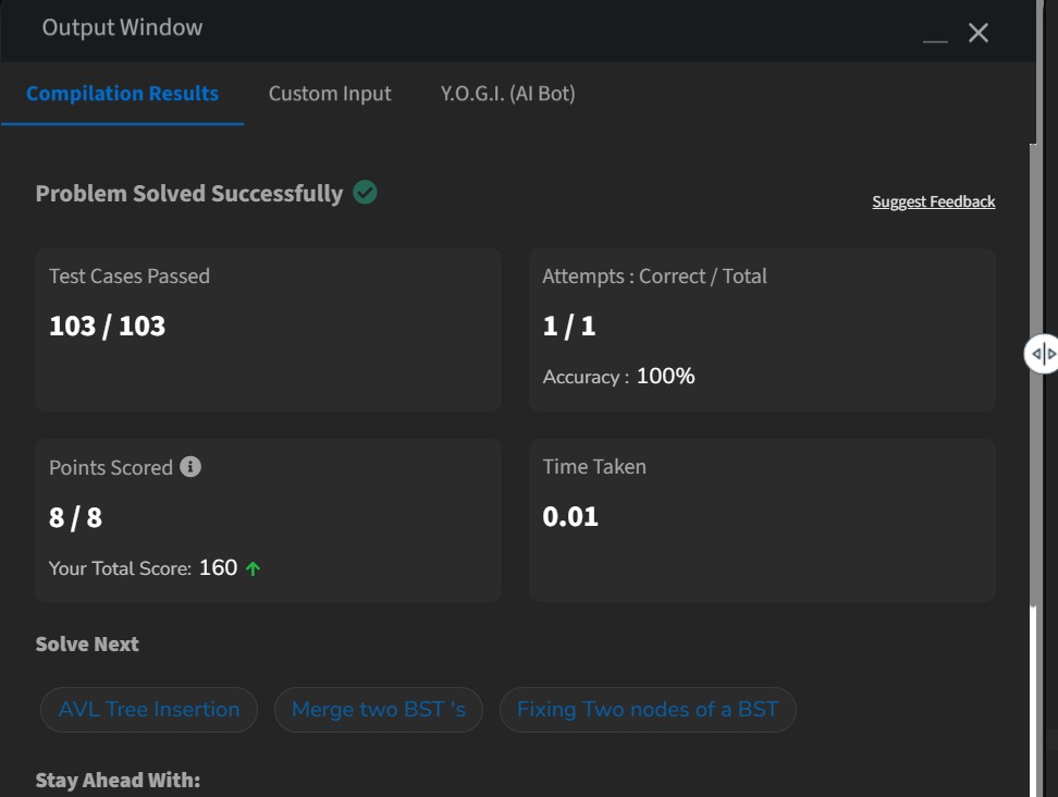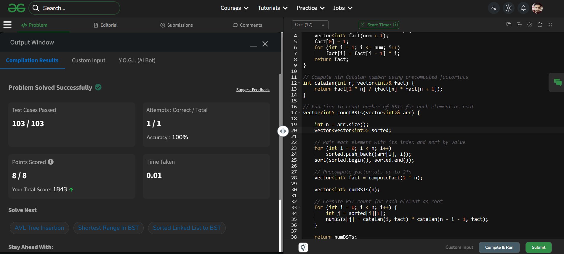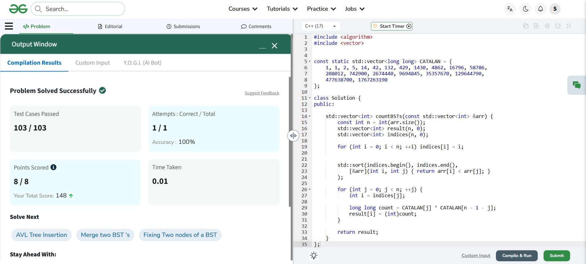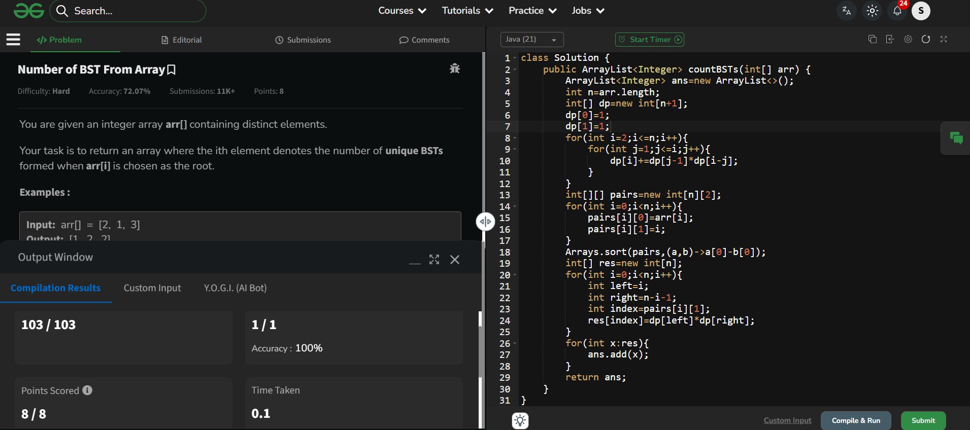 Shravya GP @GpShravya92291 · Mar 21 Day 35 of #GFG 60 Day Geek Streak 💻🔥 Solved Number of BSTs from Array 🌳 and cleared all test cases ✅ Loving the consistency and learning curve 🚀 #geekstreak60 #np@ci @geeksforgee@ks @NPCI_Nu01p 6