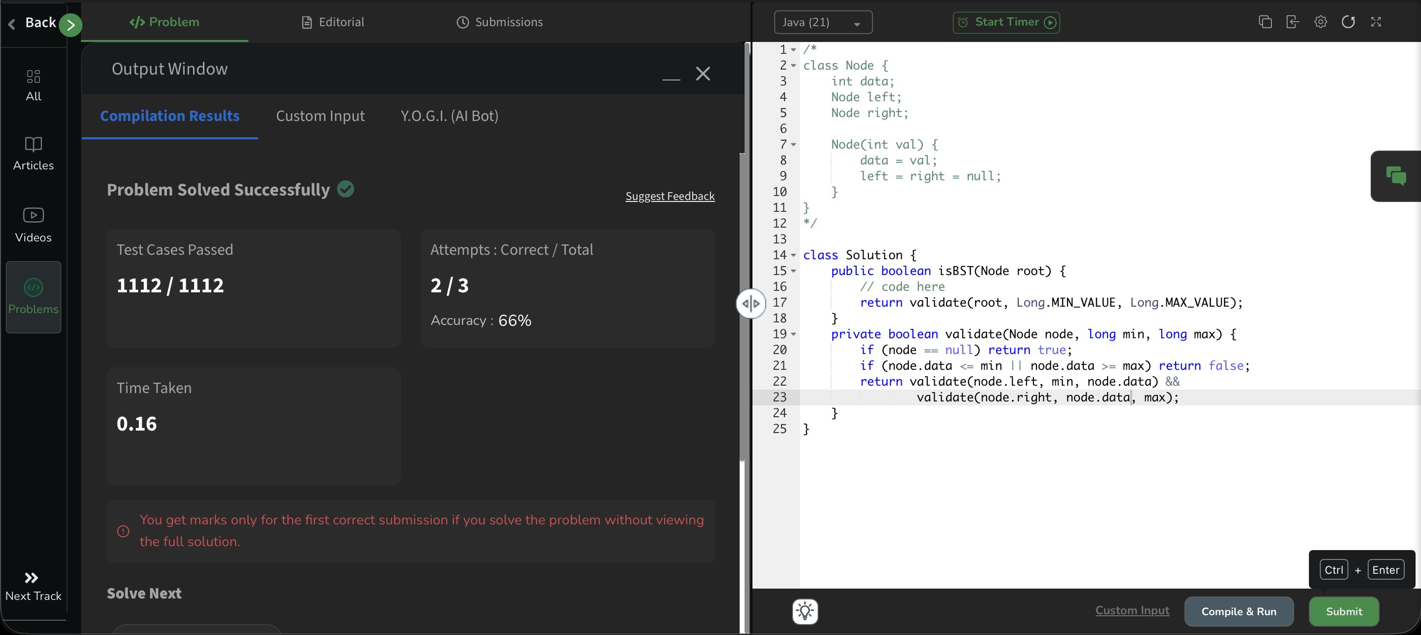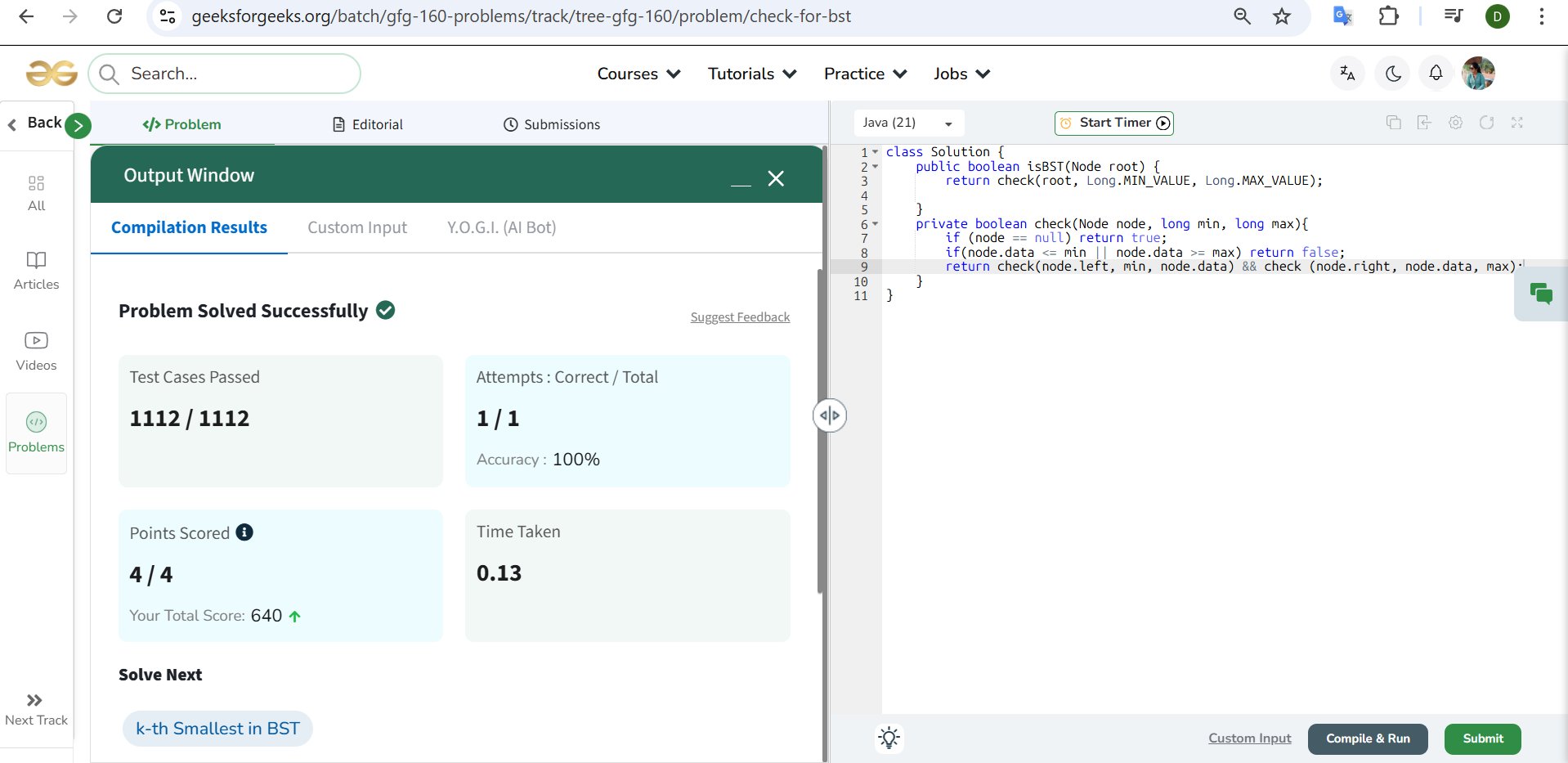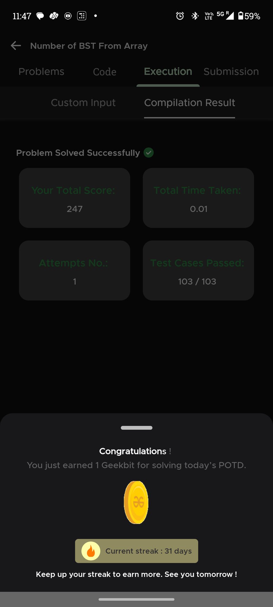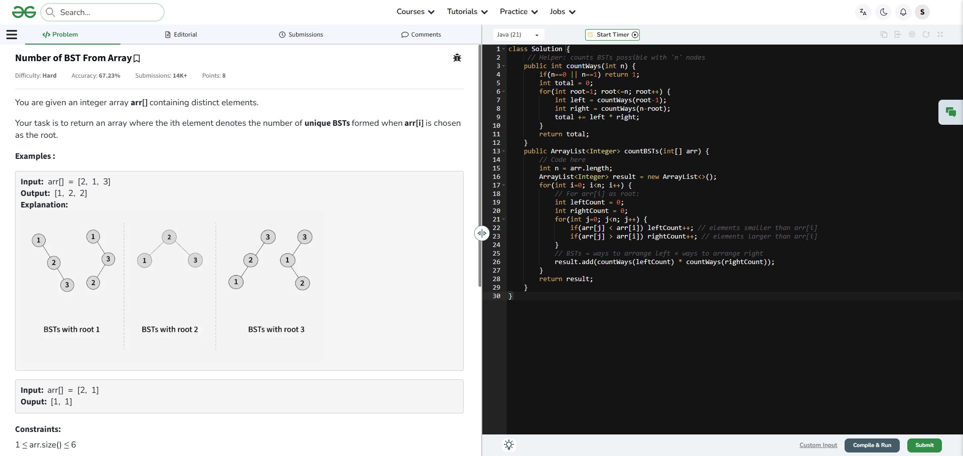 Shravya GP @GpShravya92291 · Mar 21 Day 35 of #GFG 60 Day Geek Streak 💻🔥 Solved Number of BSTs from Array 🌳 and cleared all test cases ✅ Loving the consistency and learning curve 🚀 #geekstreak60 #np@ci @geeksforgee@ks @NPCI_Nu01p 6