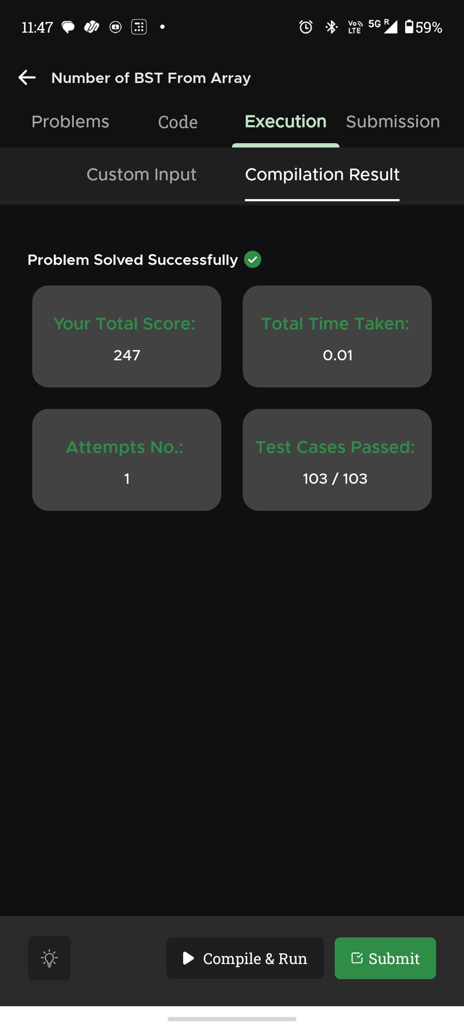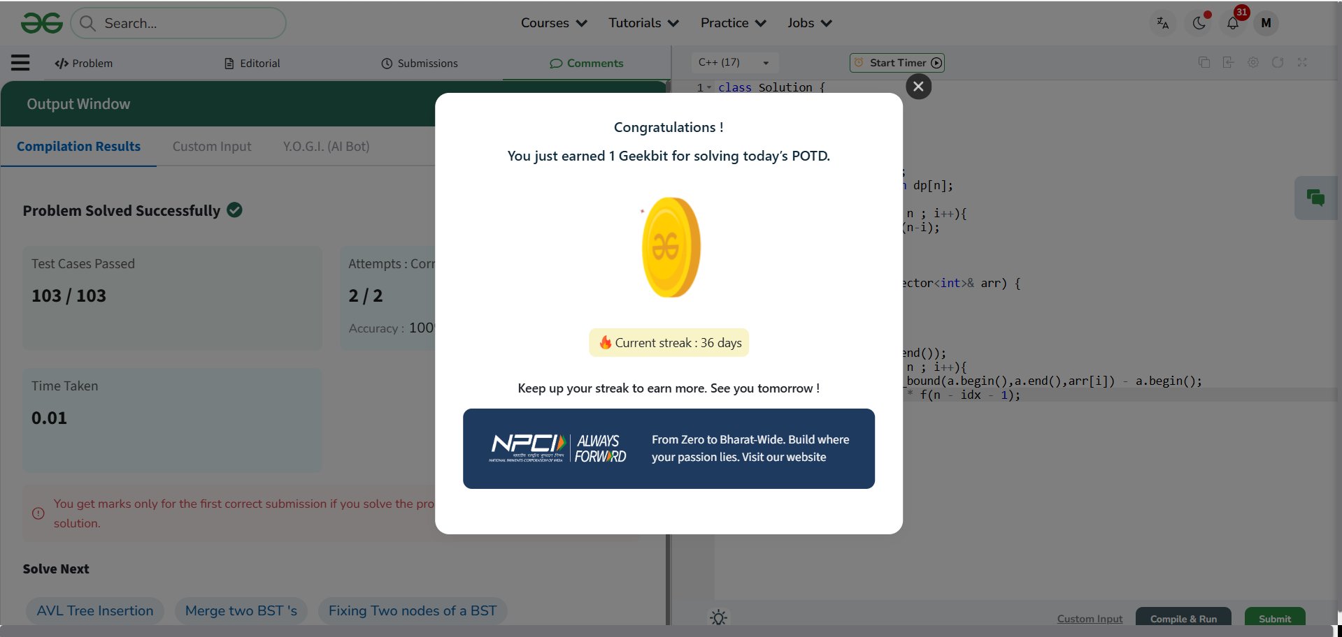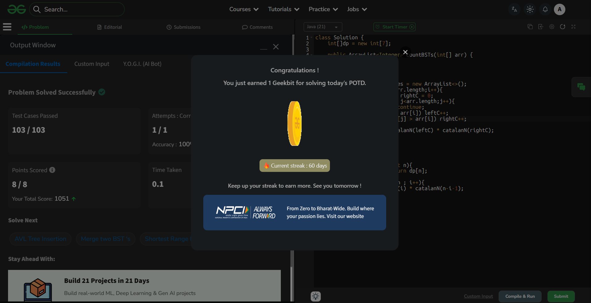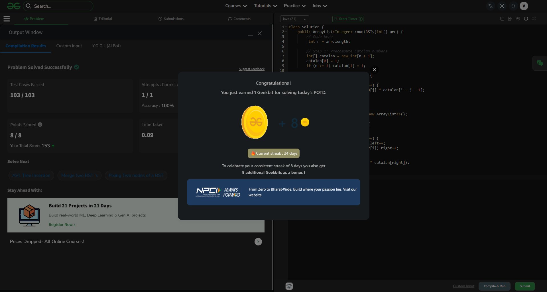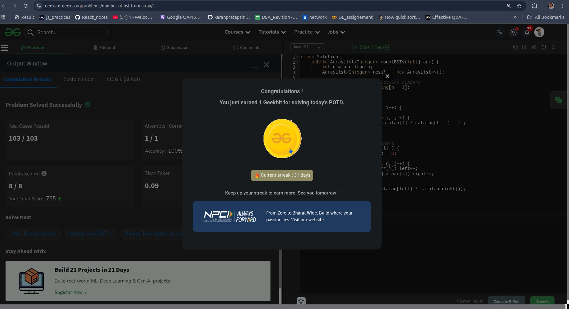 Srija Bhattacharya @aphrodite21538 · Mar 21 Mar 21 | GFG: Number of BST From Array 🌟 Test Cases: 103 / 103 Passed ✅ 🎯 Accuracy: 1/1 Attempt (100%) ⚡ Speed: 0.01s 💎 Points Earned: +8 Staying #AlwaysForward wi@th @NPCI_NPCI a@nd @geeksforgeeks ! #DailyCoding #BST #Resilience #Consistency #Day21 #geekstreak60 #np9SY 22