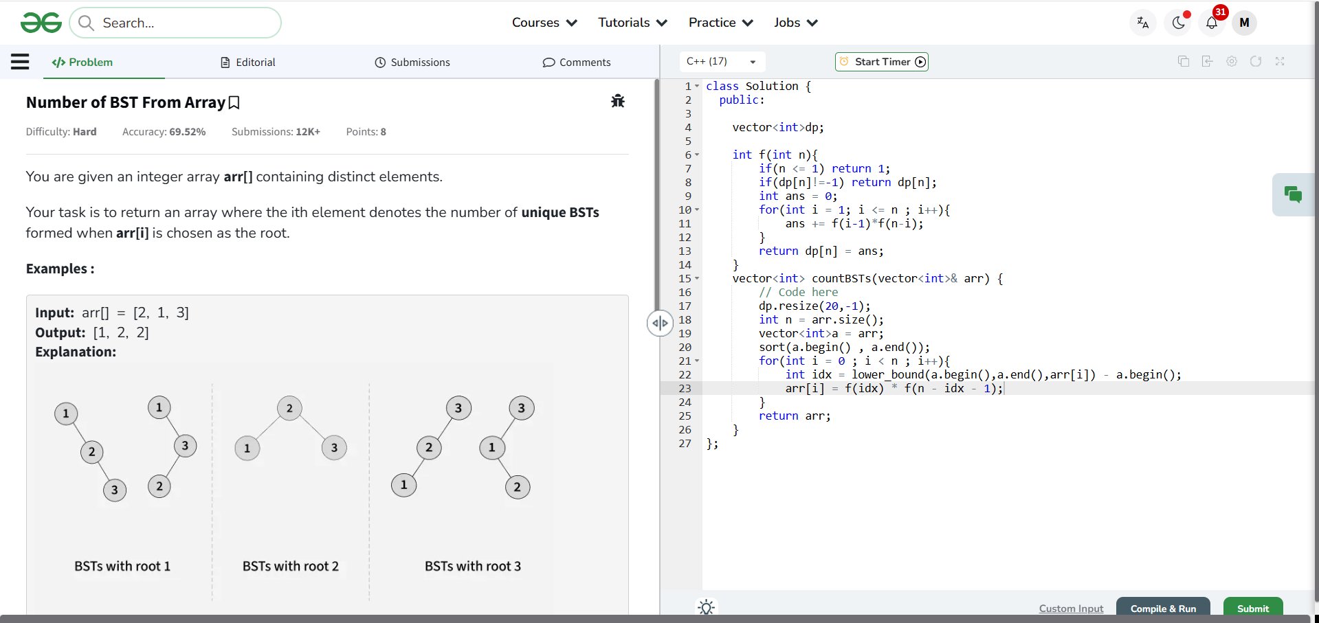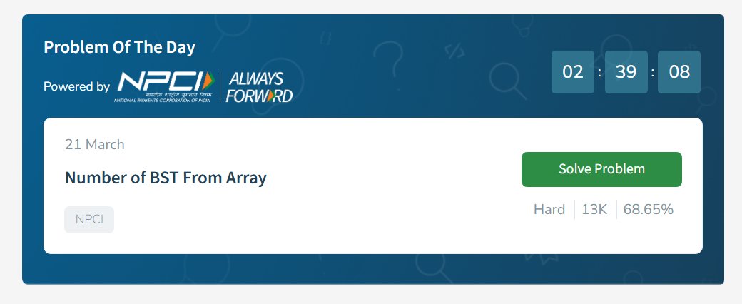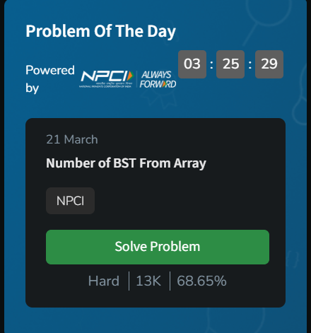 Manan Jain @jain_manan1 · Mar 21 Day 32/60 ✅ GFG Challenge! 📷Continuing my 60-day coding challenge today with the problem Number of BST From Array #geekstreak60 #npci@geeksforgeeks@NPCI_NPCIA 1 7