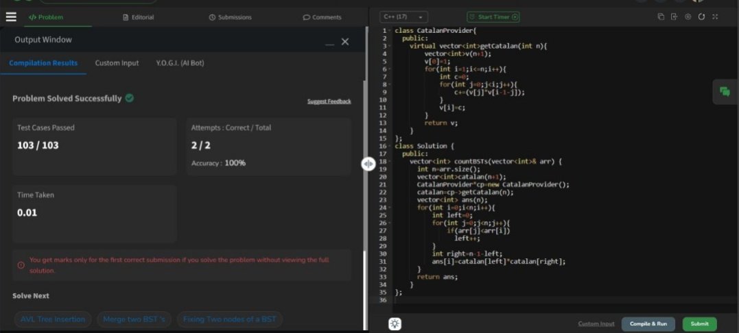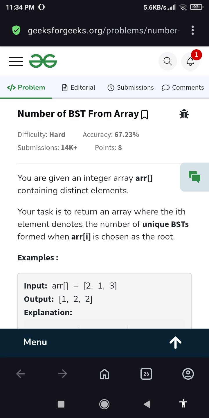 MOHD SAUBAN @SaubanMohd42492 · Mar 21 Day 346 of GFG Challenge: "Number of BST From Array" Time Complexity: O(n log n) Auxiliary Space: O(n) #geekstreak60 #npci #GFGChallenge #geeksforgeeks 2 23