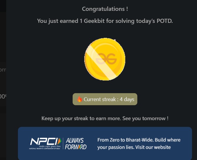 Saurabh Agrahari @maxcoder143 · Mar 21 Hey there today is my 31/60 problem solving at gfg. @geeksforgeeks @NPCI_NPCI #npci #geekstreak60