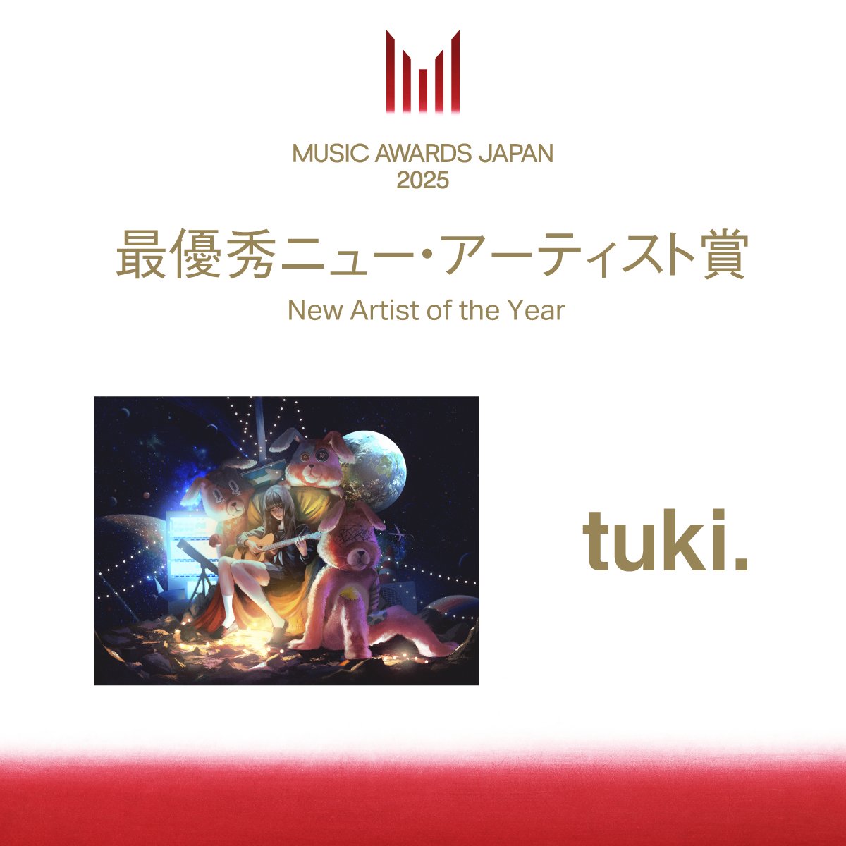 The "New Artist of the Year" award at MUSIC AWARDS JAPAN 2025 went to "tuki.". The 16-year-old singer-songwriter, who shot to prominence with her debut single "Bansanka", was not at the ceremony to collect her "Ruby".