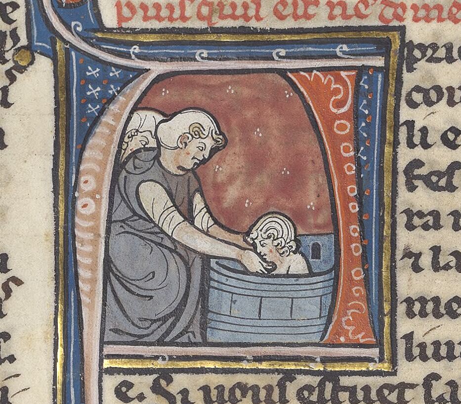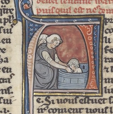 Cup therapy, possibly on someone in a hip-bath & mother washing child.