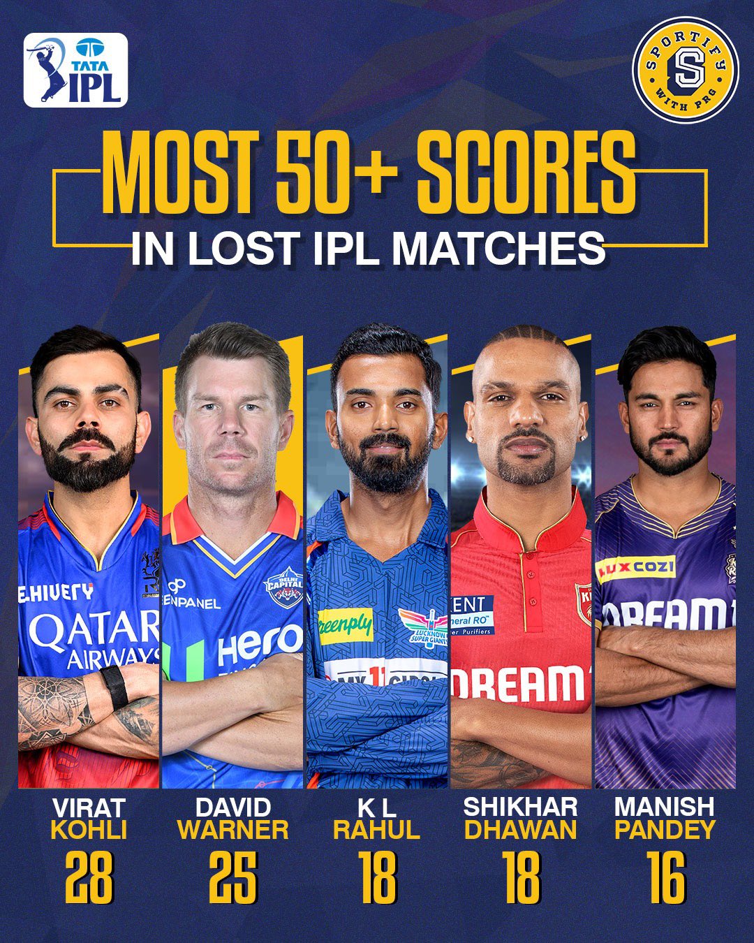 Meet the batting stars of the Lost IPL matches, Virat Kohli, David Warner, K L Rahul, Shikhar Dhawan, and Manish Pandey, each crossing the 50-run mark and making a lasting impact on the tournament. Who do you think will shine next? Share your thoughts!