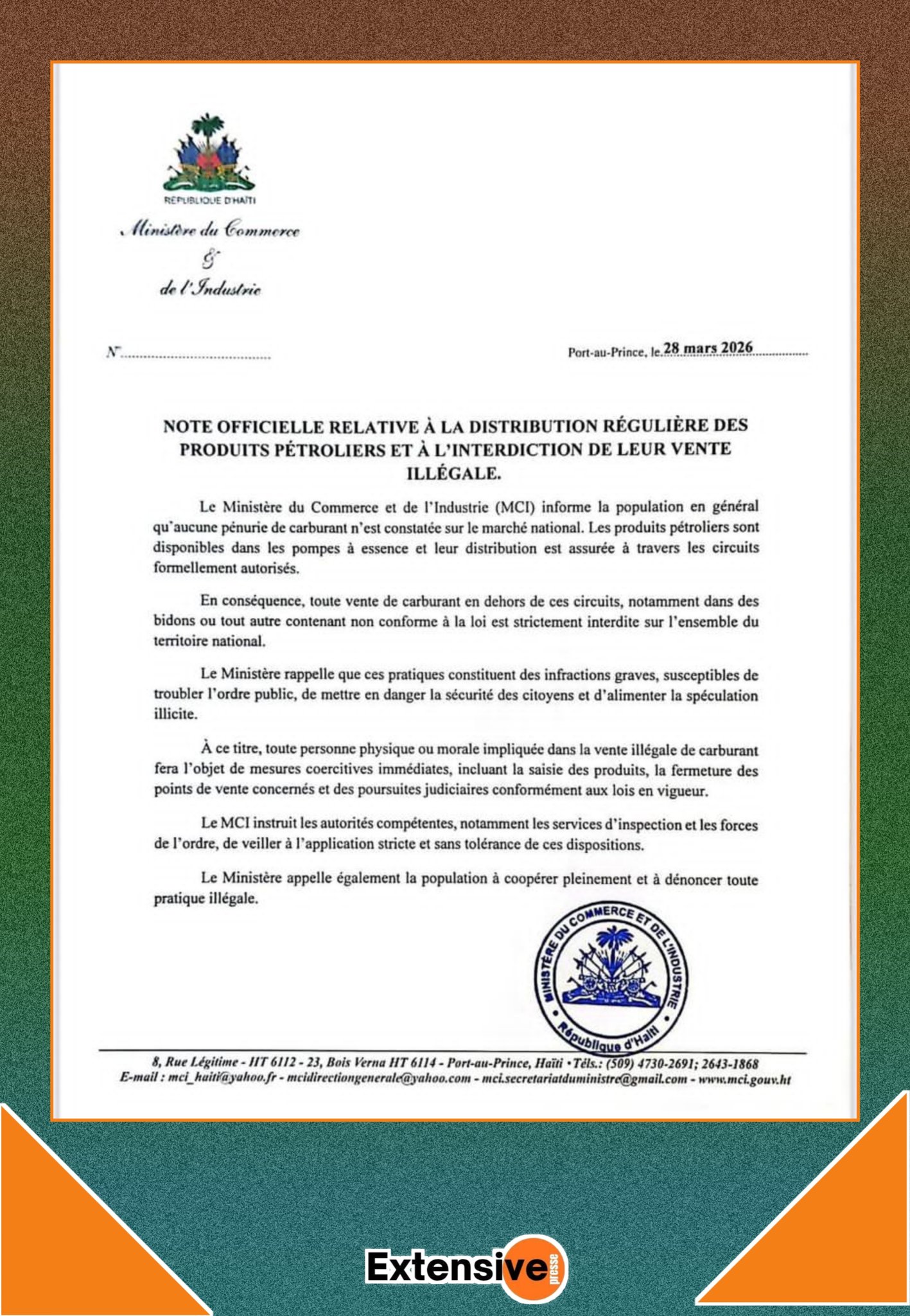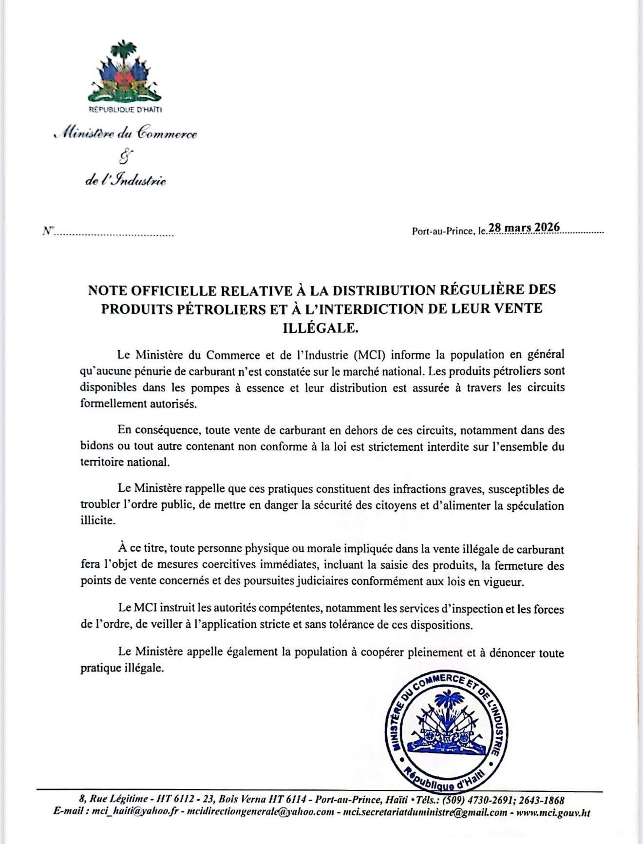 In a press release on Saturday, the Ministry of Commerce and Industry (MCI) informed the general public that "no fuel ved on the national market. Petroleum products are available at gas stations and their distribution is ensured through formally authorized channels."