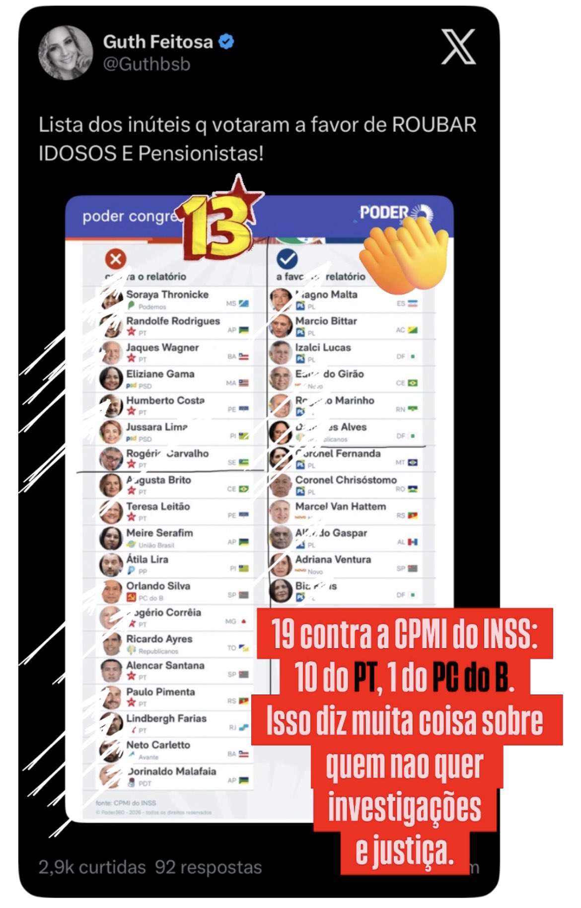 PT e aliados tiraram a investigação do roub0 dos velhinhos e deficientes do INSS, que comprometiam o filho, o irmão . PT comemorou efusivamente em público.