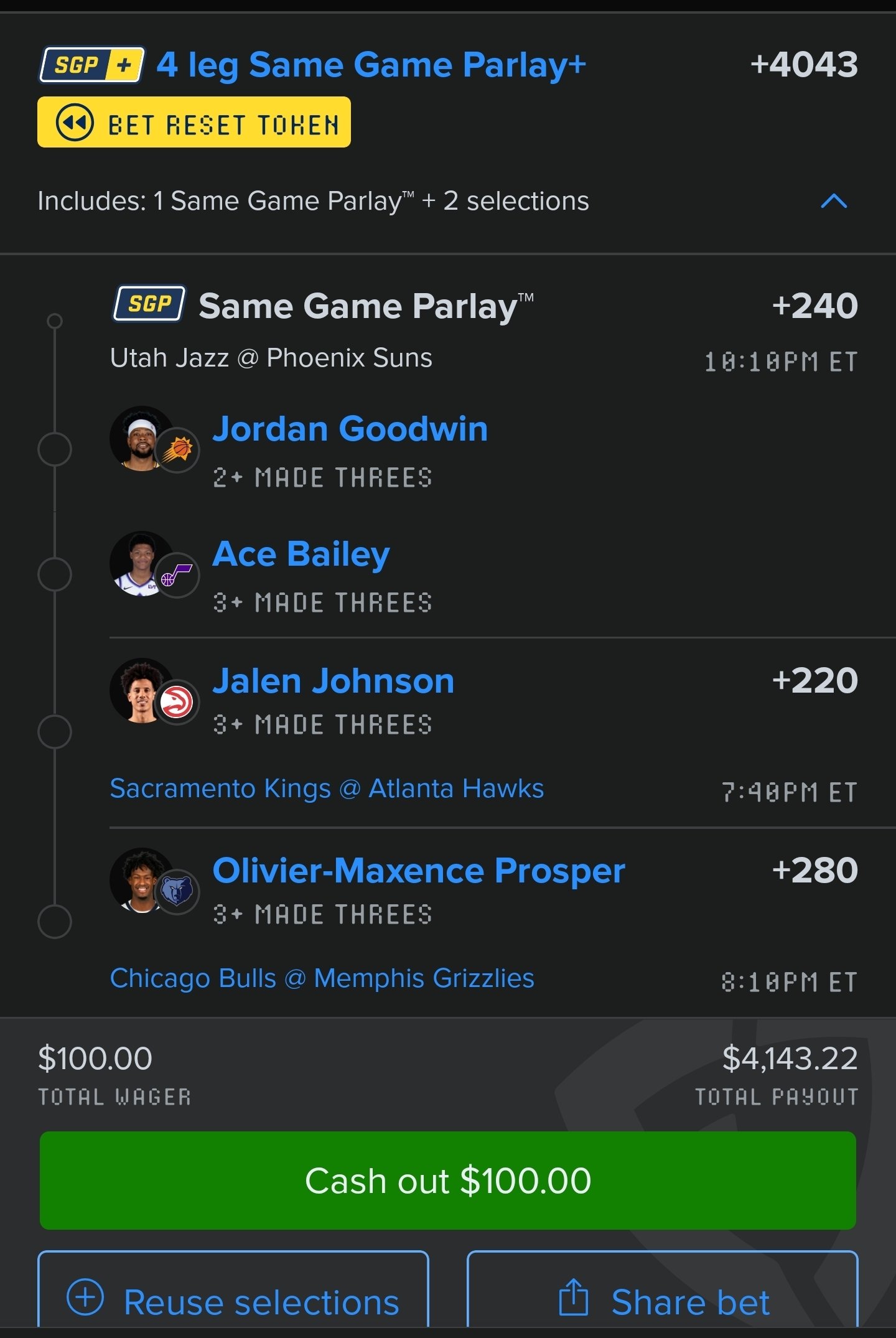 @sharpboyjon@Playbook@PropFinderApp I'm probably going to regret lowering Goodwin to 2 and adding Bailey for 3.. now i see why hes not on any slips. 29th vs Suns Def. Probably should have kept Goodwin at 3 and left Ace off. But oh well its a no sweat. But I'm greedy.