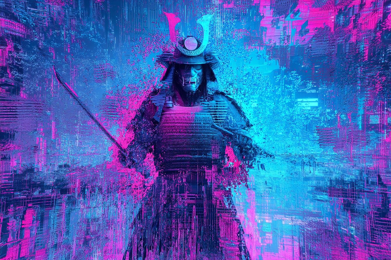 [SUBJECT] depicted in a Glitchwave Digital Overload, where distorted pixels and fragmented code create a frenetic atmosphere. Utilize a neon-lit color scheme of [COLOR1] and [COLOR2] to emphasize the digital chaos.
