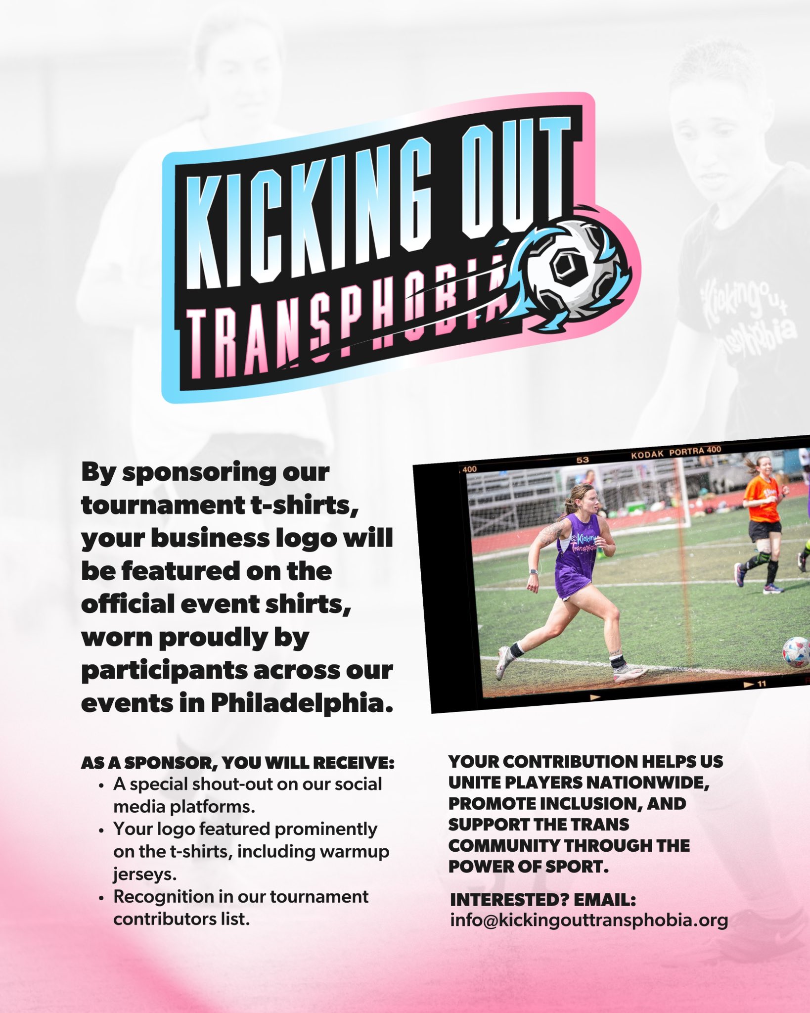 Stand with Inclusion: Sponsor our tournament shirts! We want to express our gratitude to #mistr, @icarus_football, @SoHoPhilly, @TransJusticeFP, and @WatchPartyPHL for making a significant difference and positively impacting people’s lives. #transgender #transrights