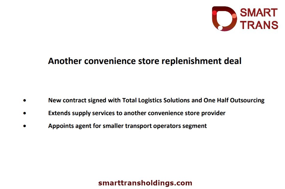 SmartTrans @SmartTrans_SMA · Jan 25, 2018 (#ASX: $SMA) #SmartTrans is pleased to announce its #SaaS Telematics Supply Chain division has signed a new contract with Total Logistics Solutions (TLS) and One Half Outsourcing (OHO). Read more: asx.com.au/asxpdf/2018012… #logistics #supplychain #Ausbiz #investing #news 4 6