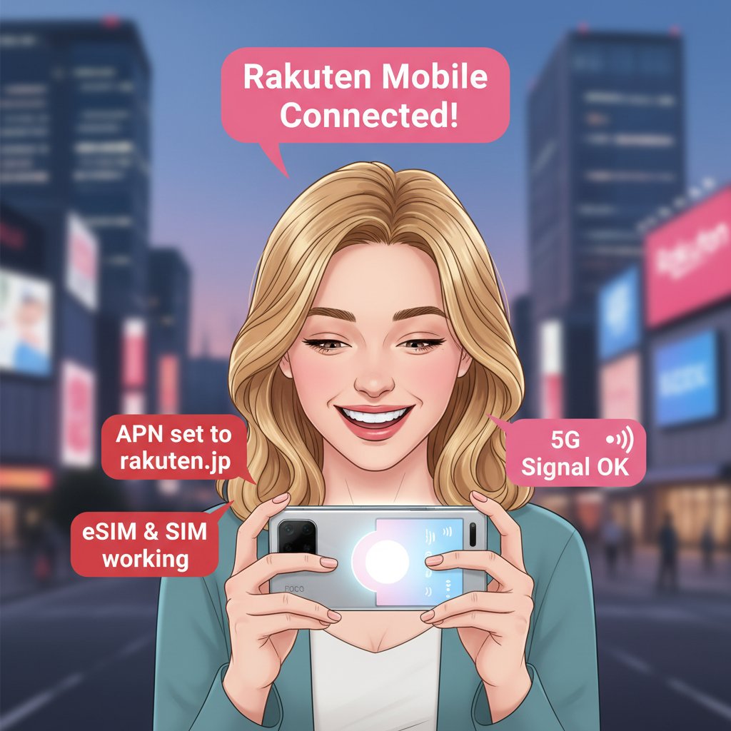 POCO F8 Proは楽天モバイルの主要バンドをフルサポートし、物理SIM挿入でアンテナが立ち、APN「rakuten.jp」が自動設定されます
